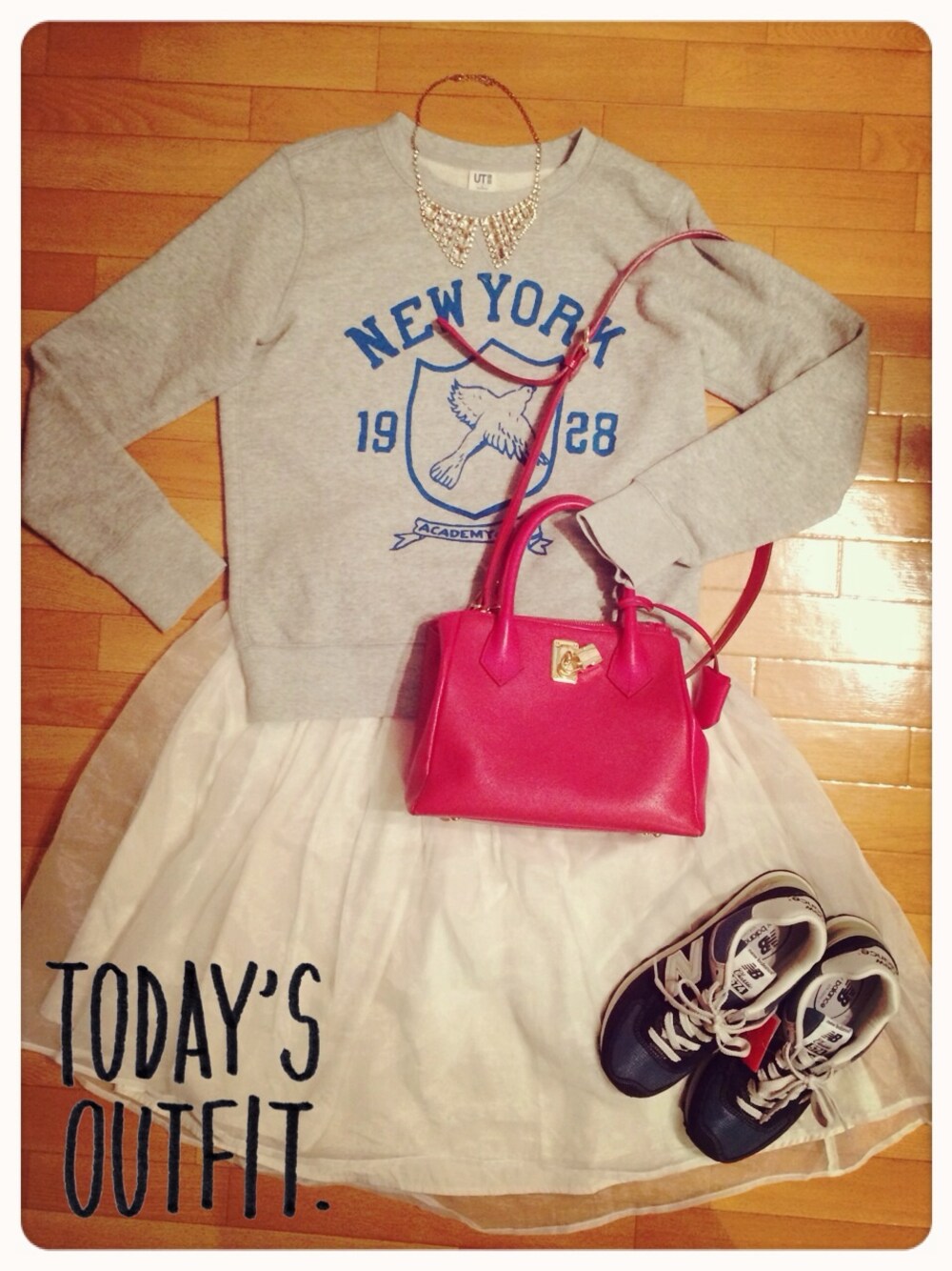スエット:UNIQLO スカート:マーキュリーデュオ スニーカー:ニューバランス バッグ:サマンサタバサ + Gジャン:H&M まだ履いてない ニューバランスのスニーカー♡ 早く履きたいな♪