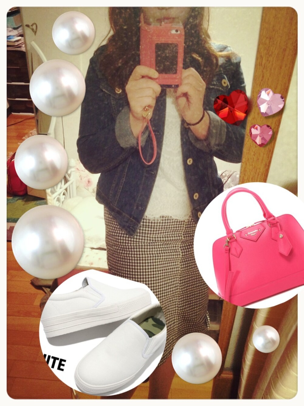 部屋が汚いので全力で隠しました♡ ギンガムチェックのタイトスカートすごい使える〜*\(^o^)/* ピンクバック持つとルンルンになれる!