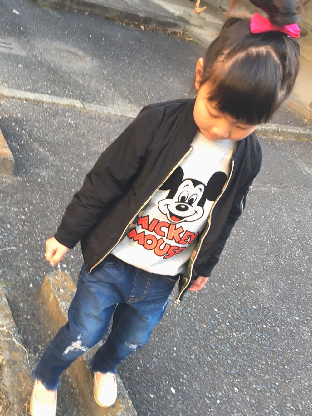 先日妹と姉妹でお揃いを購入しました♡ ジャケットはリバーシブル♡ トップスは 姉は4歳105㎝ぐらいでL 妹は2歳86㎝ぐらいでSです🐭 デニムはジャストサイズでM ウエストとラインは思ってたより少し大きめでした