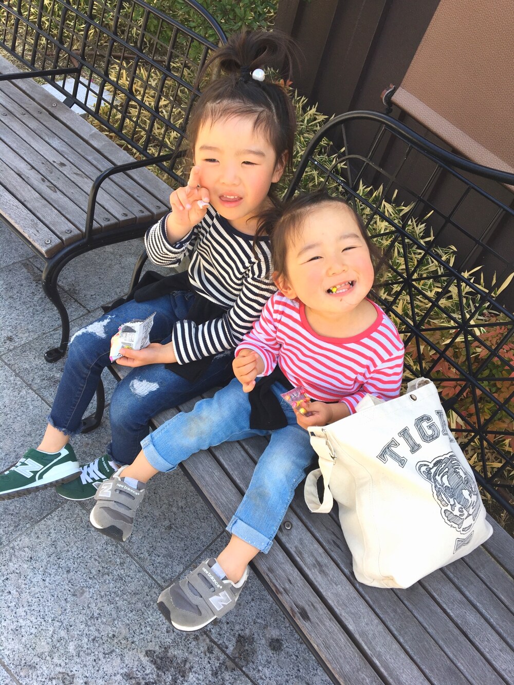 お天気なので‥ 外でオヤツタイム♡ トップスUNIQLO 姉120 妹110 大きめですが首もとがあまり空いてないので♡
