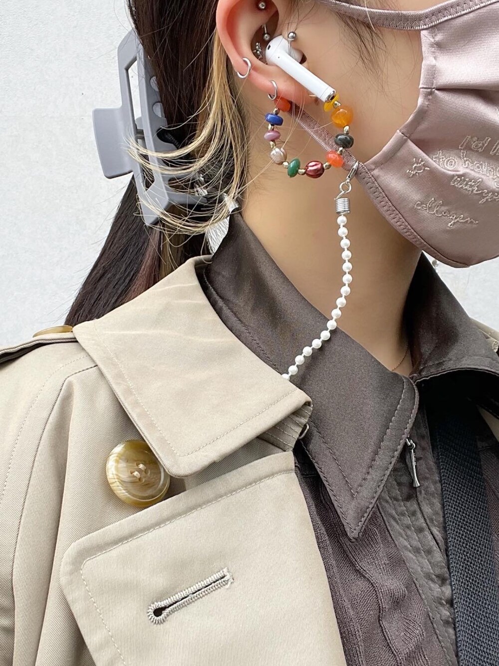 グレー系のトップス、ピンク系のマスクを着用したレディースの冬コーディネートの1枚目の写真