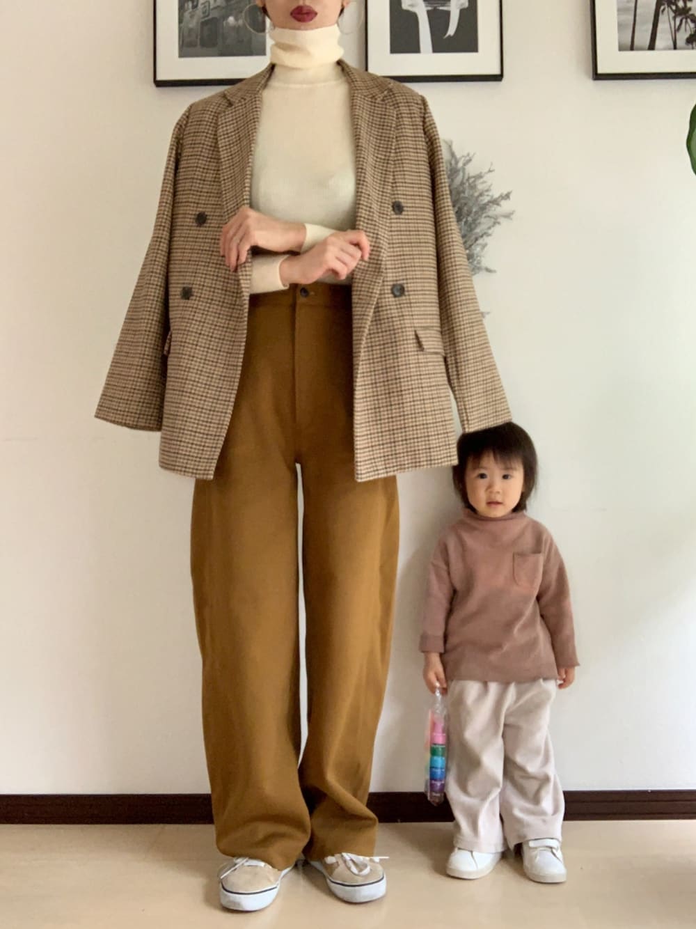 おはようございます😃 ご覧頂きありがとうございます‼︎ UNIQLOのカーブジャジーパンツの色違いを、ジャケットに合わせて大人カジュアルに👟 今日は娘が撮ると言いだし、自分で服を出し、靴を左右逆に履き、クレヨンを鞄にセルフタイマーを押しました🤣笑 お陰で鞄を持つのを忘れました。。