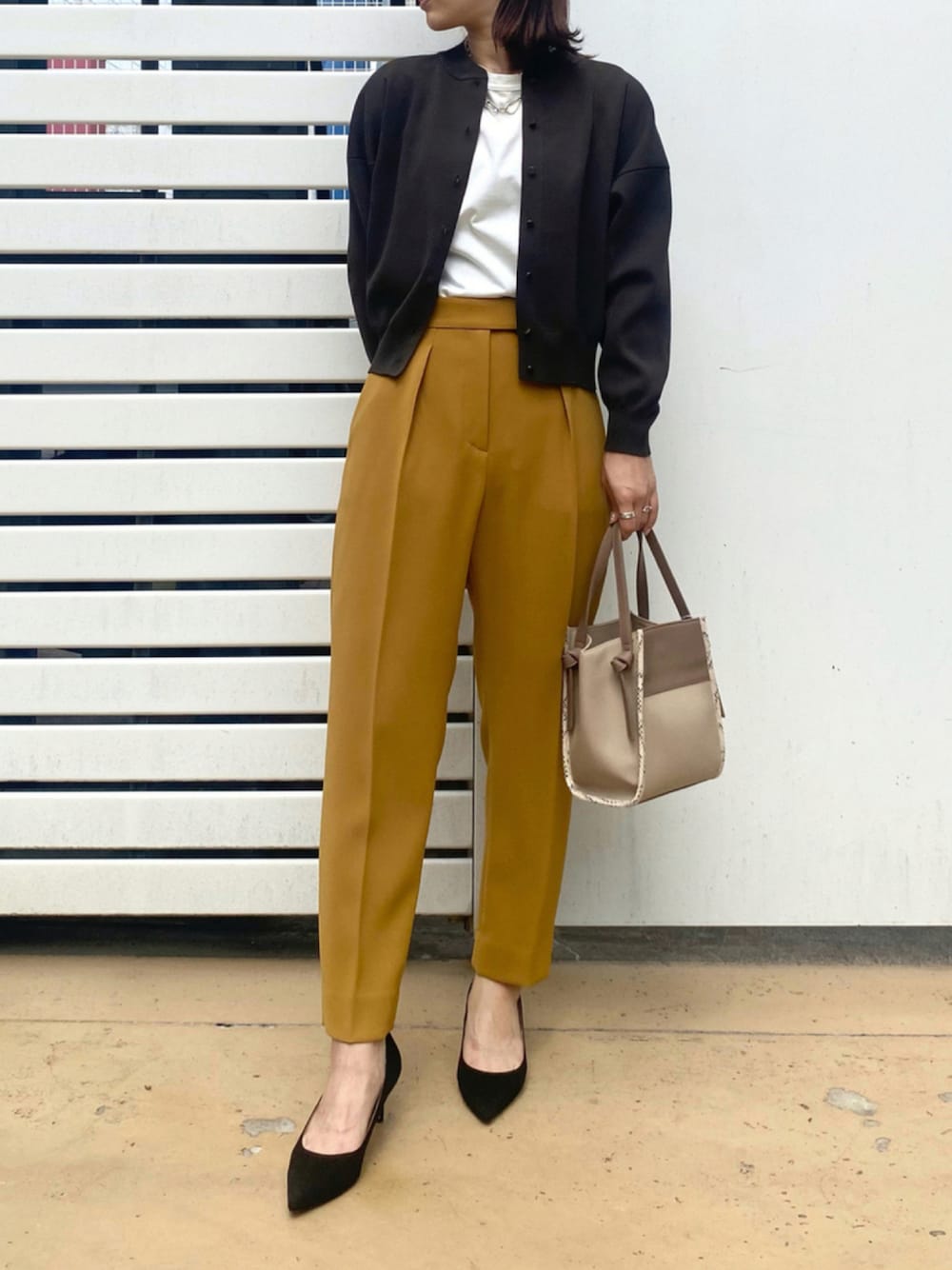 マスタードカラーのパンツと、ブラウンのニットブルゾンを合わせた秋先取りコーデ🍠🍠