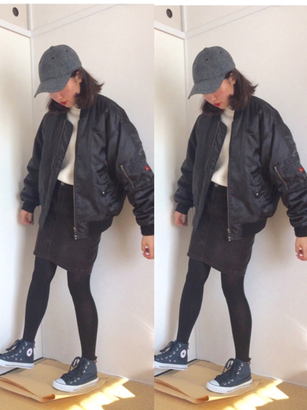 久々のwear 上から cap/UNIQLO 500円 ニット/UNIQLO メンズ 1290円 ma_1/楽天 3000円 コーデュロイスカート/gap 母から貰い物 スニーカー/コンバース 5000円 ハイカットのコンバースは後ろにチャックが付いてて履きやすいです