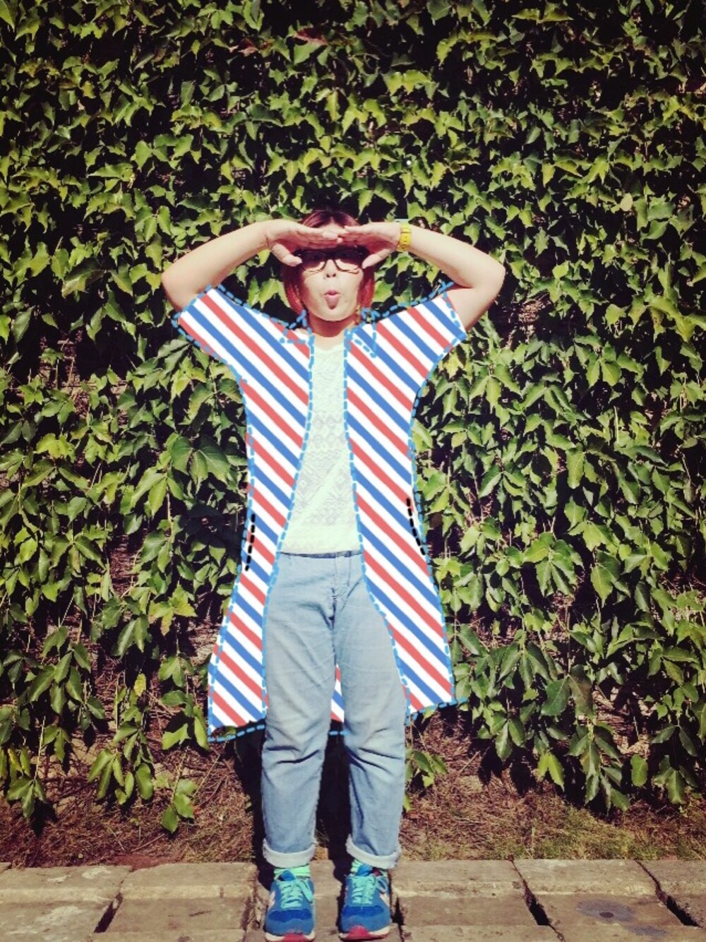 鏤空白上衣、牛仔褲,搭配手繪長外套修飾