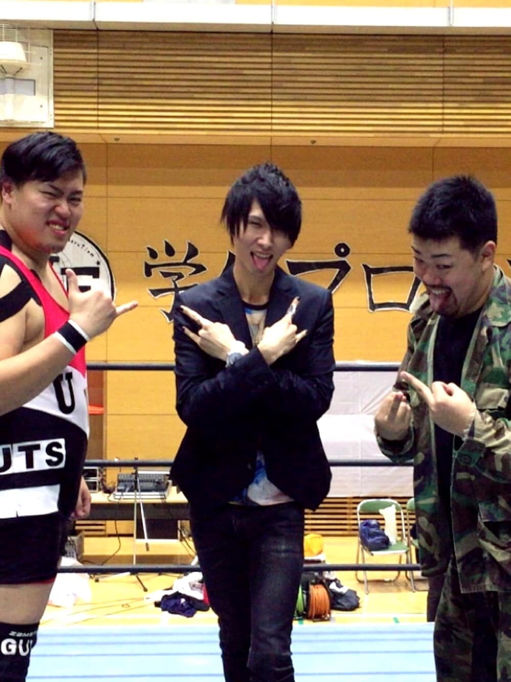 東洋大学文化祭!学生プロレス!!!見に行ってきました!!! 最高でした!!!! 右が"とにかくヤリたい秋山"選手と左が"ガッツ人妻"選手です!! 試合中の悪役のようなドSな笑顔がとても素晴らしかったです! なお選手達は全くヒールキャラではないらしかったです(白目)