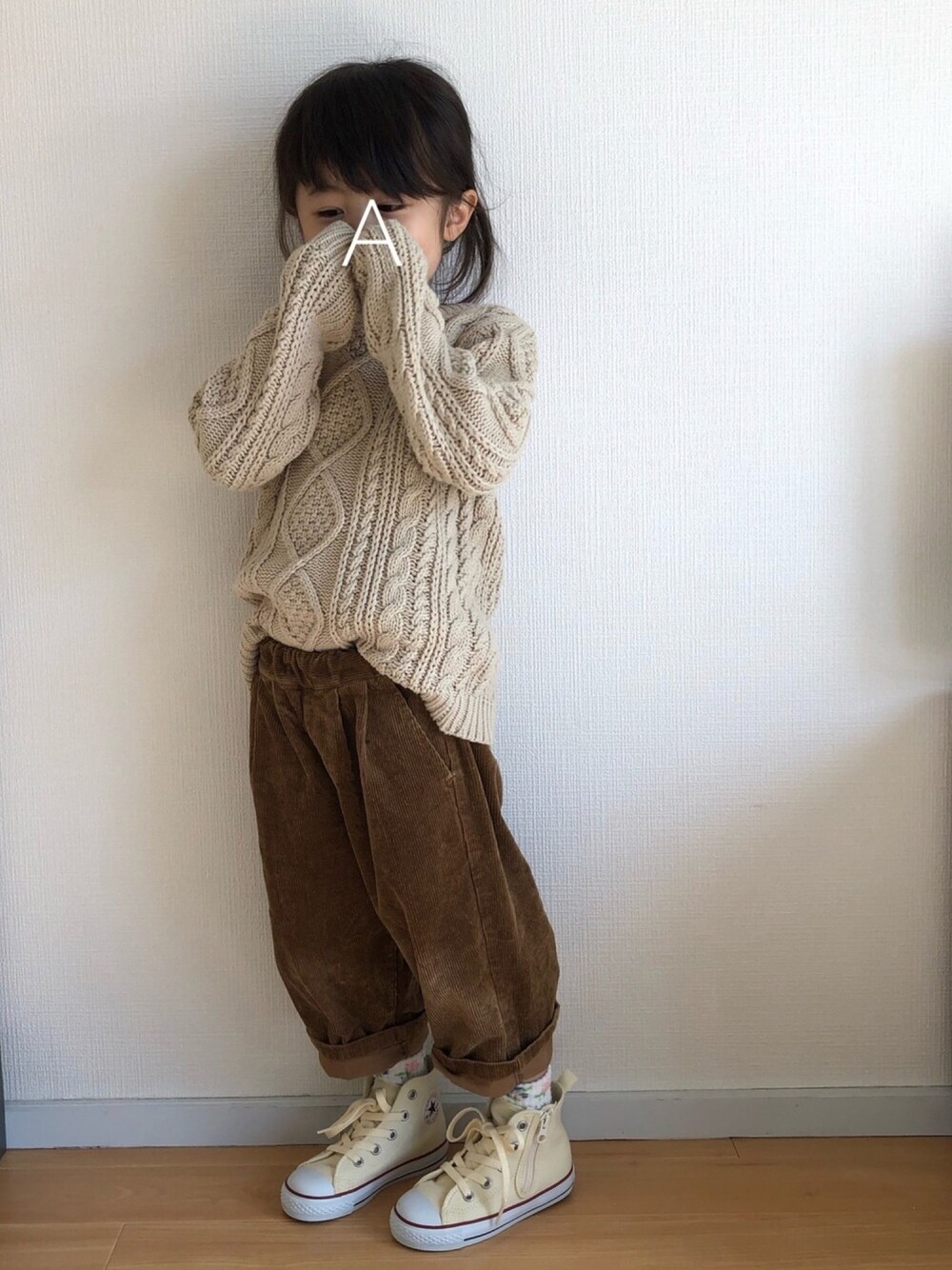 お越しいただきありがとうございます♡ 昨日の投稿に沢山お見舞いメッセージありがとうございます! 本人は熱も1日で下がり 食欲もいつも通りで 元気を持て余しておりました😂 お返事はひとつひとつ、後ほど返させて下さいね🙏 そんな昨日のこーで。 ケーブルニットにコーデュロイパンツで ブラウンに染まったよ🤎 パンツ一折りして こっそり見える花柄ソックスがポイント💙 ちなみにこれ。 「はい!手はどこにいったでしょーかっ!?」 …4歳児のマジックショー、継続中🤣🤣🤣 *************************** 4歳6ヶ月 身長 104.7 体重 15.6 tops 120 bottoms S shoes 17 ***************************