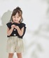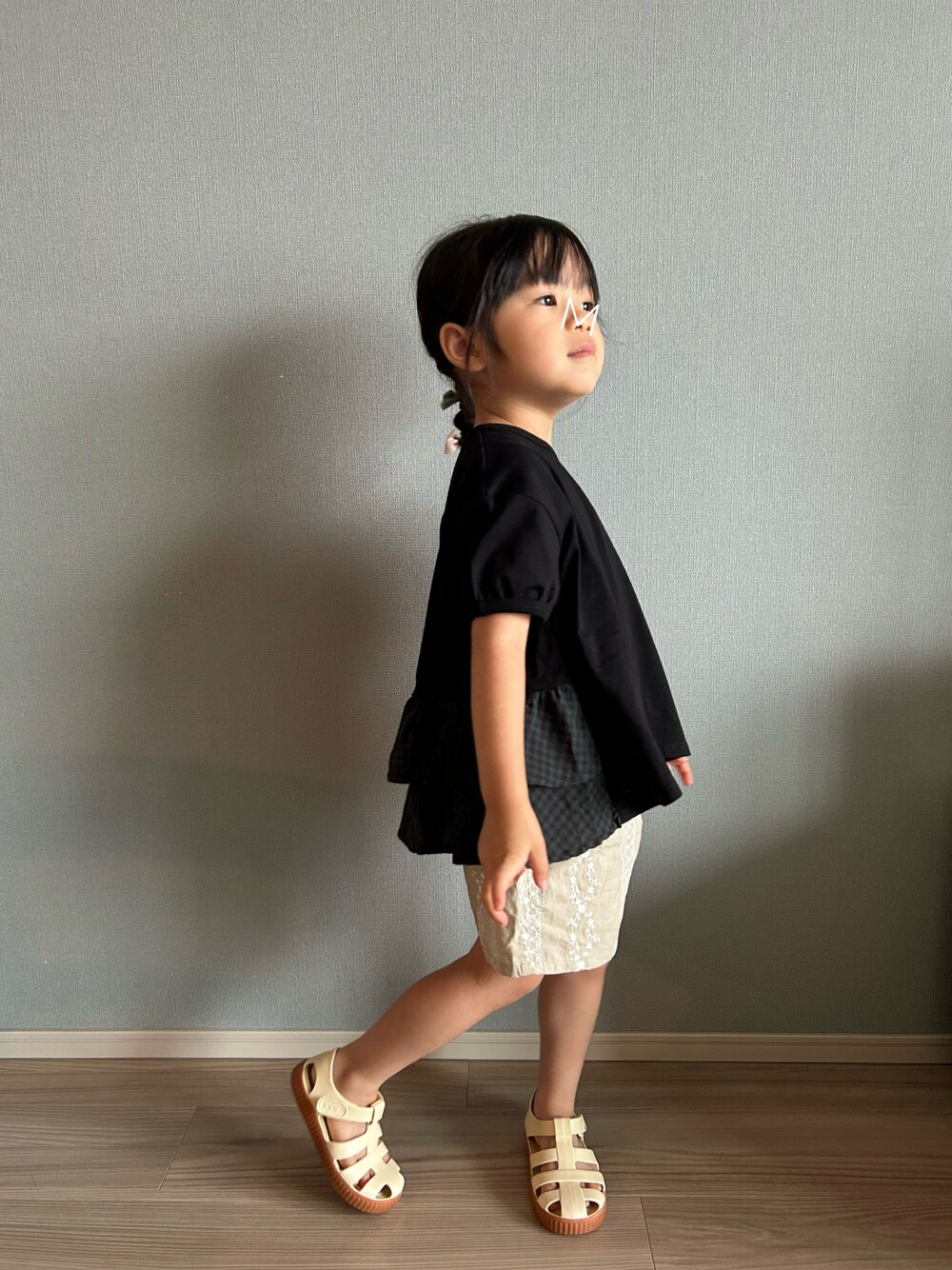 "かわいい"大好き女子のMさんは 普段ブラックを着てくれませんが、 これは後ろのフリルが刺さったようでヘビロテ中♩ 動きがつくとなお可愛い。 同じくヘビロテ中のショーパンは、 刺繍が可愛くてこちらも本人お気に入り♡ この組み合わせでリアル保育園コーデです👧