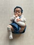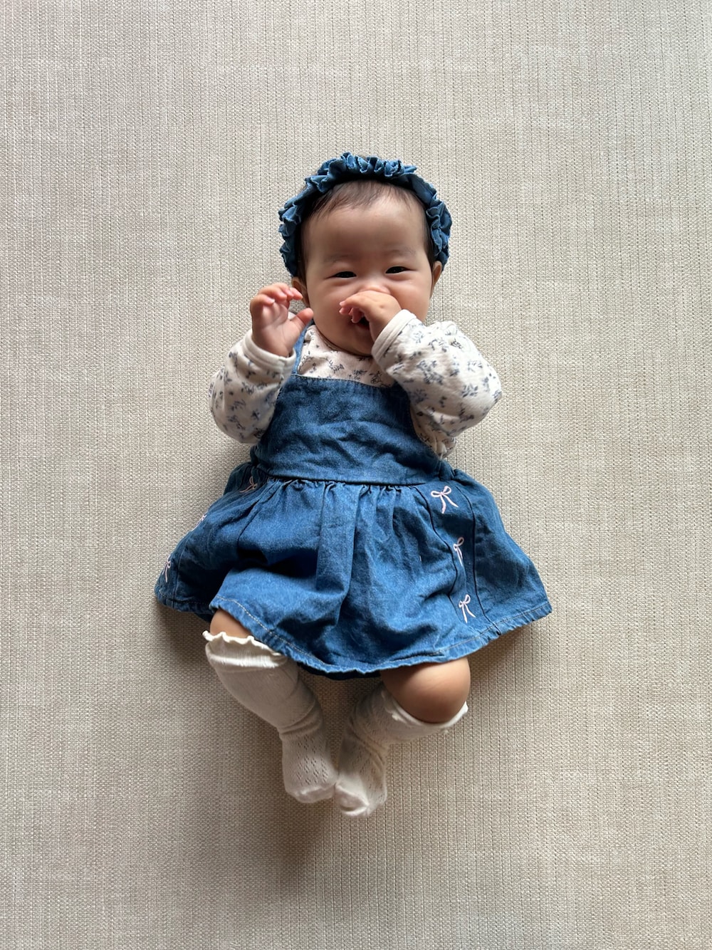 お越しいただきありがとうございます♡ ジャンスカにデニムのカチューシャで デニムコーデ🤍💙 インナーに着てるボディスーツが小花柄で可愛い! 肌着としてお店に置いてあったけど、 生地も暖かそうでこれからの季節 重ね着するのに重宝間違いない◎