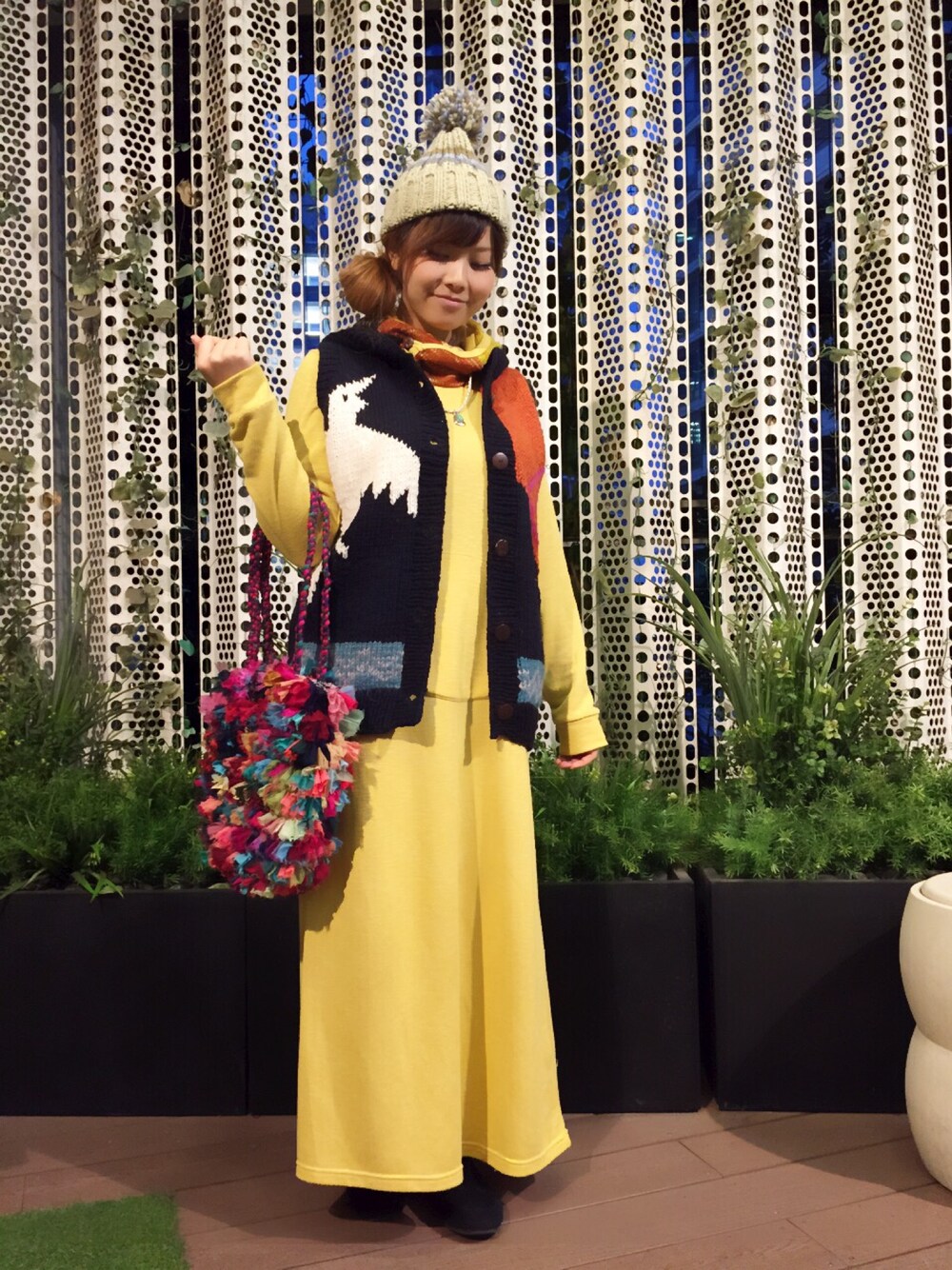 お久しぶりの投稿です。 みなさんこんばんは!*\(^o^)/* 今日は、ハッピーイエローなワンピースとインドのお母さんが手編みしてくれたニットのベストで元気なコーデにしてみました🎵 ベイクォーターでは、大きなクリスマスツリーが飾られてすっかりクリスマスムードです!🎄 チャイハネベイクォーターのLINEができました! ID @cayhane22 お友達になると5%OFFクーポンがもらえます✨よかったら、やってみてください🎵