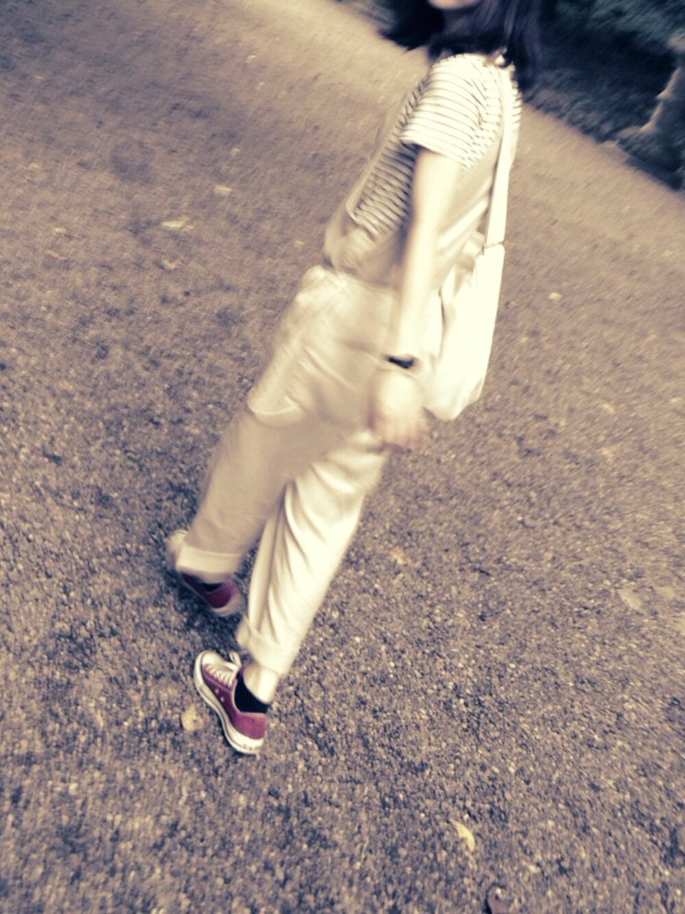 昔ローリーズファームで買った麻入りのオーバーオールにボーダーTシャツを合わせて。 白キャンバスショルダーで全体にナチュラルカラー。 ポイントカラーで赤のコンバースを。
