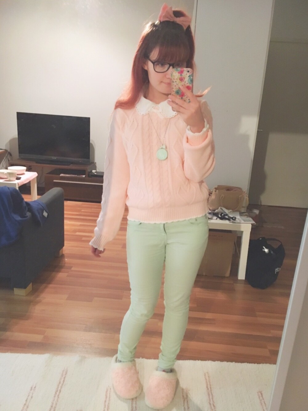 アオロラのニット/セーター「Dear my love [ハートケーブル編みセータースカラップリボンガーリーニットプルオーバートップス]」を使ったコーディネート