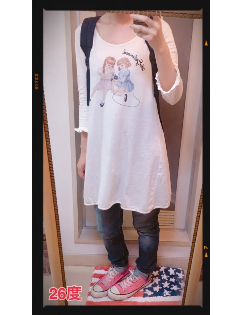 ホワイト系のワンピース、ブルー系のデニムパンツ、ピンク系のスニーカーを着用したレディースの春コーディネートの1枚目の写真
