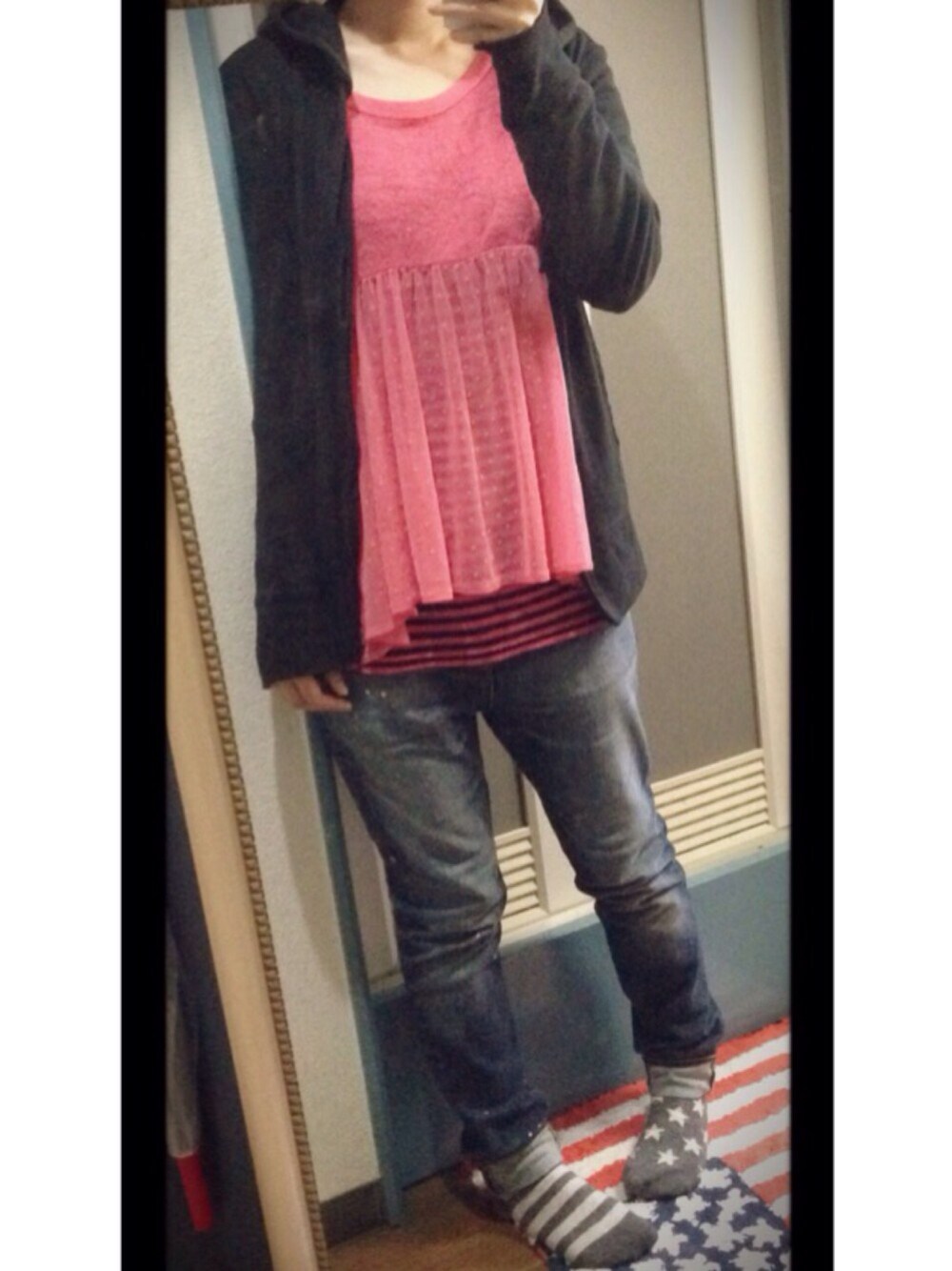 ひらひらチュール付きニットに ユニクロのパーカーとデニム! 左右柄が違う靴下お気に入り〜〜