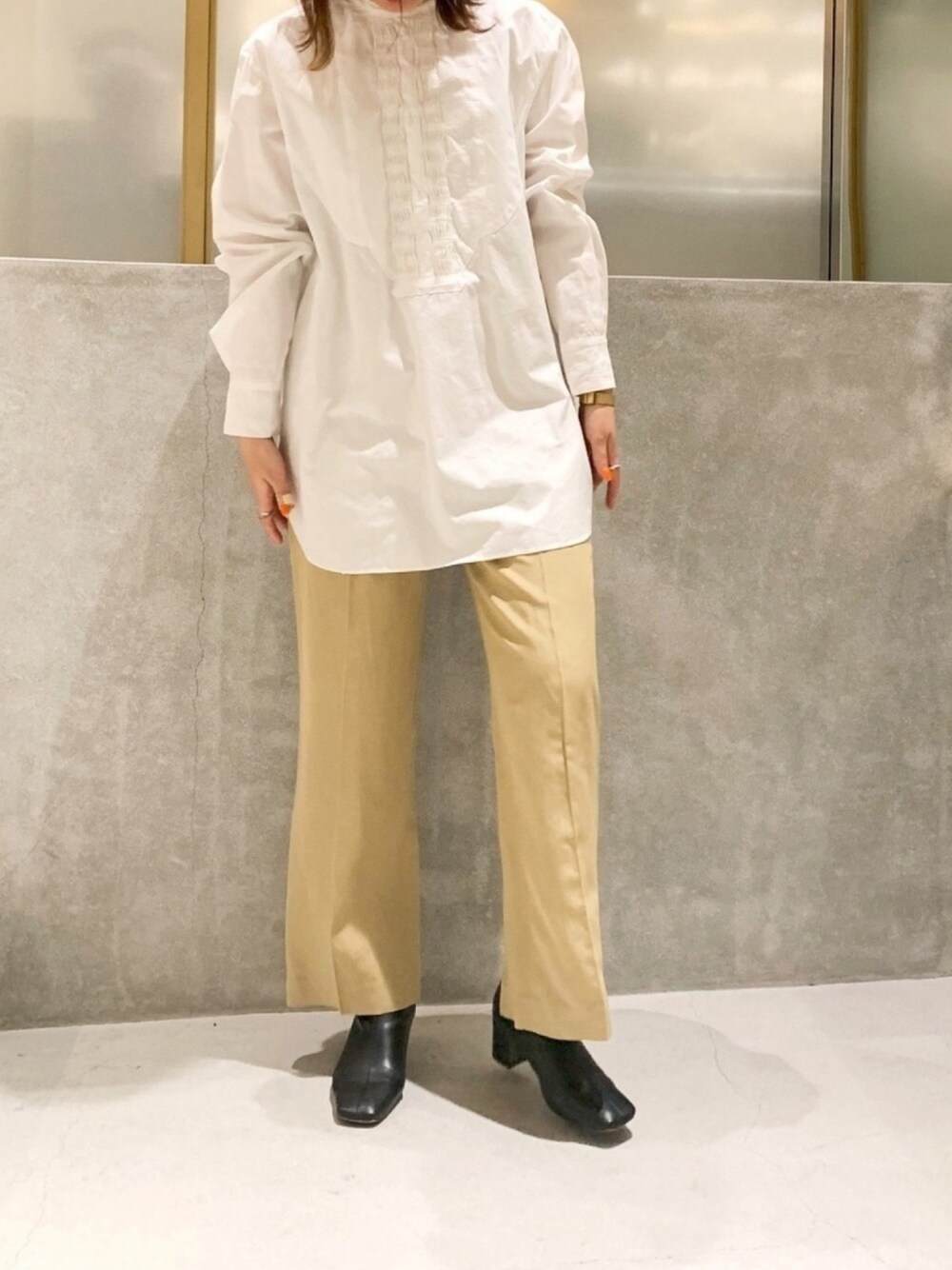 最近yellowが好きです🌼🌼🧀 バックスリットが抜群に可愛いパンツ + ピンタックのデザインがおしゃシャツ ほわ〜っとした黄色なので足元に黒ブーツを🐼