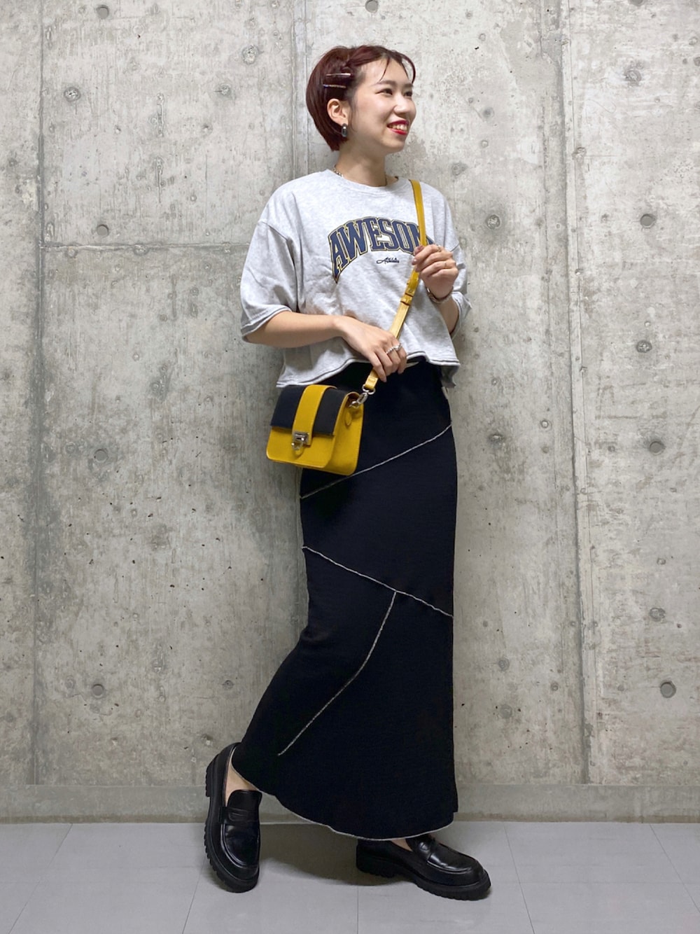 staff board ▶︎あやぱんで検索 【大人カジュアルコーデ】 グレーのロゴTシャツ×黒のスカートを合わせたモノトーンコーデ⭐︎ イエローの鞄を合わせて明るさをプラスしました^^