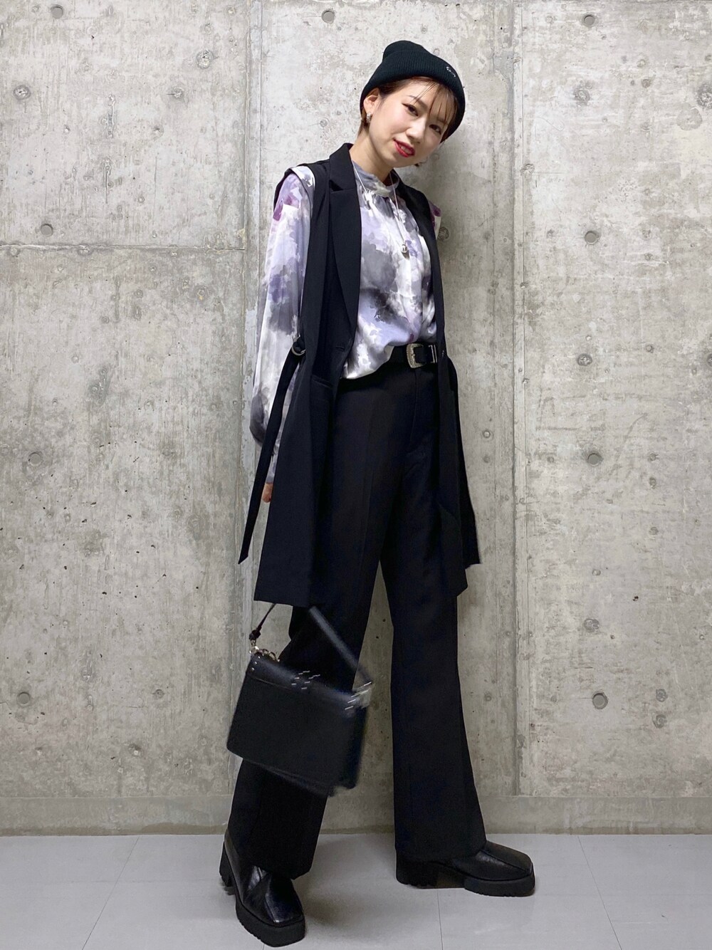 staff board ▶︎あやぱんで検索 --モードカジュアルコーデ-- 秋服はモノトーンになりがちですが、柄物を取り入れるだけで一気に垢抜けコーデになります◎ マーブル柄なので派手になりすぎなくて、インナーとして挑戦しやすいです♡