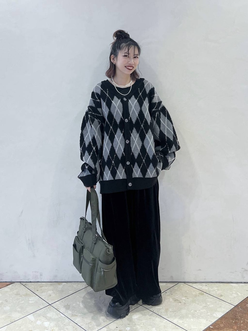 【カーディガン】 コーデのアクセントにピッタリなアーガイル柄♦︎ 体のラインを拾わないビッグなシルエットでラフコーデに。 長めの丈感でお尻周りもしっかりカバーしてくれます! 【ベロアパンツ】 ゆったりストレートシルエットなカジュアルパンツ。 体型カバーもバッチリでストレスフリーな履き心地です◎ 着用アイテムは画面下からCheck⭐︎ お気に入りコーデやアイテムは右下の♡をTAPで繰り返し見れます! 毎日staff boardも更新しているのでぜひフォローして下さい★