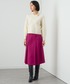 少しハリ感のあるボウタイブラウスは、透け感はありながら、ウール混なので、秋?冬にかけて活躍間違いなしの1枚。 お袖もギャザーのふんわり感があって、ブラウス自体も体型を拾いません。 スカートも秋らしく濃いめのピンクが目を惹き、ポリエステルですが、程良い肉感のAラインスカート。 長すぎない着丈なので、ロングブーツと合わせると一気に大人の着こなしができます。 はおりにはANAYI定番の配色カーディガン。 ブラウスに合わせて黒をチョイス。 柔らかい素材感とコンパクトすぎない着丈やサイズ感がゆったりしてるので、着心地は抜群。 今からの季節には、配色カーディガンが必ず活躍します。 選ぶカラーをグッと秋よりにシフトし、デイリーから通勤まで幅広く着まわせるコーディネートのご提案です。