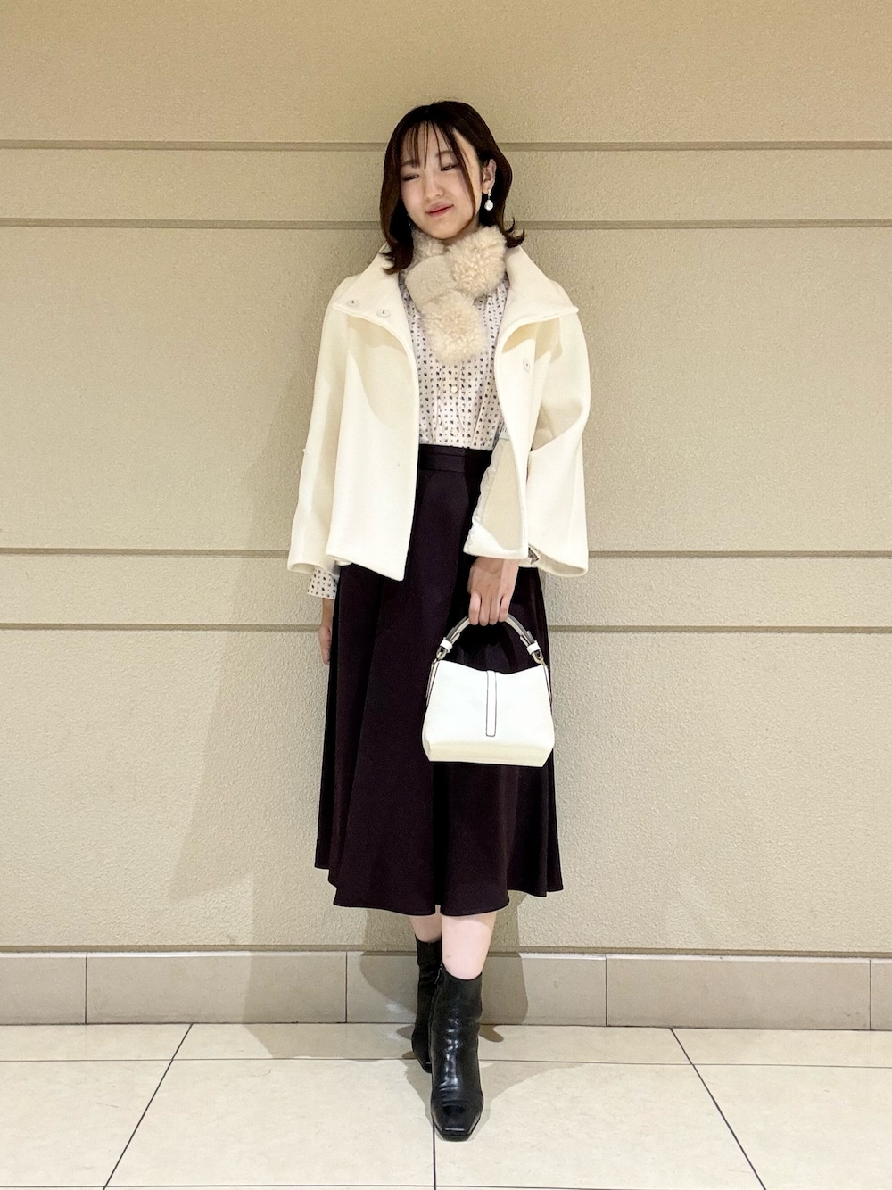 【スタイリングポイント】 デイリーからお出かけ、デートなど様々シーンで着用可能なスタイリング。 ショートコートはカシミヤファーストールとの相性が良く可愛いだけではなく、防寒性にも優れています。 【素材感】 ・ウールビーバーショートコート 滑らかな光沢感のビーバー仕上げにした、ウールコート ・幾何ドットパフショルブラウス 中肉のバックサテンジョーゼット素材。 白でも透け感気にせず着用可能。 ・ダブルサテンタックベルトフレアスカート 程よい肉感と張りのあるサテン素材。 【サイズ感】 ・ウールビーバーショートコート スカートにもパンツにも合わせやすい絶妙な丈感と袖がふんわりしたトップスも合わせやすい万能ケープシルエット。 ・幾何ドットパフショルブラウス パワーショルダーデザインですが、いつもより脇下ゆとりがあるので、窮屈さを感じません。 ・ダブルサテンタックベルトフレアスカート 着丈長めのシンプルなフレアサイズ。