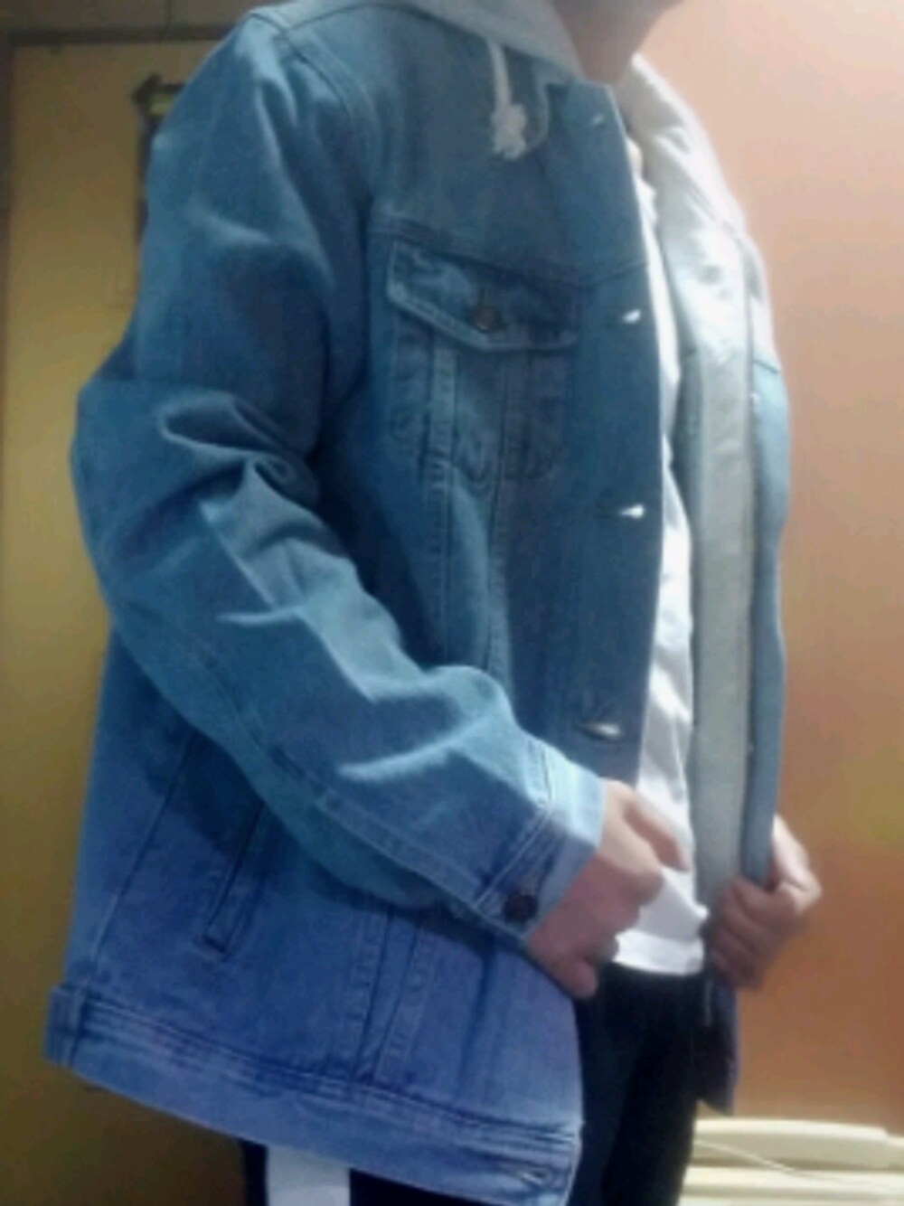ブルー系のデニムジャケットを着用したメンズの冬コーディネートの1枚目の写真