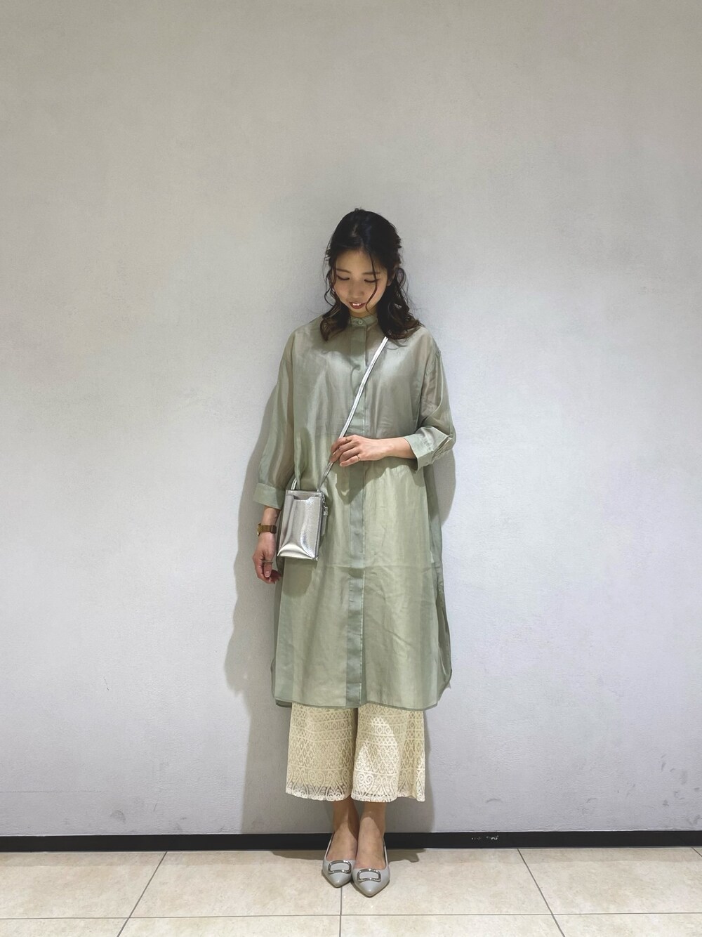Ohmoriのシャツワンピース「シアーバンドカラーシャツワンピース」を使ったコーディネート