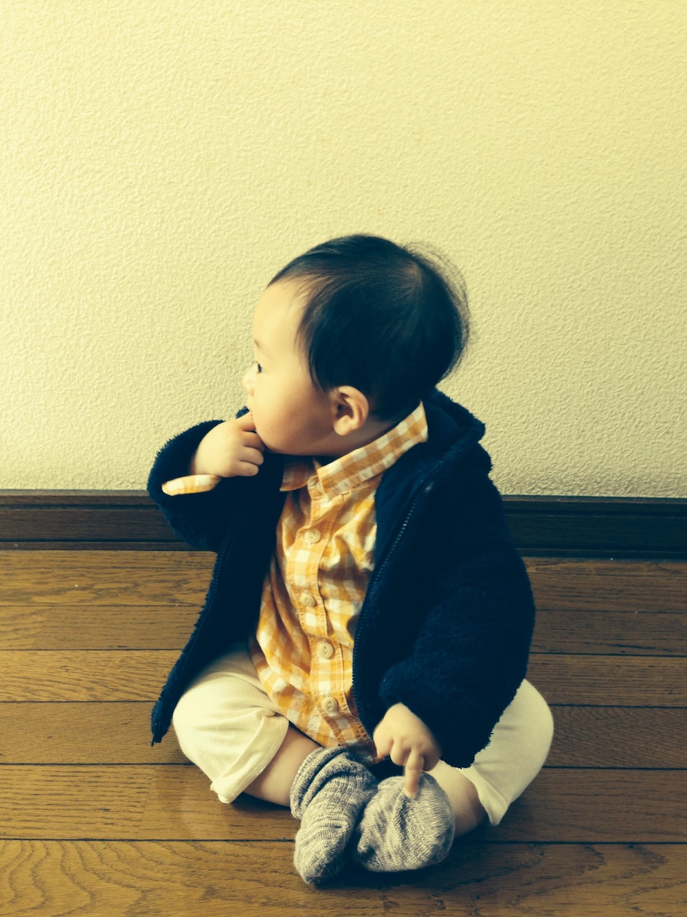 パーカーが暑そう(。-_-。) 保育園の洗礼をさっそく受ける。 母胃腸炎→息子風邪→父母風邪うつされる(´Д` ) 園の先生に胃腸炎一番乗りと笑われる、トホホー