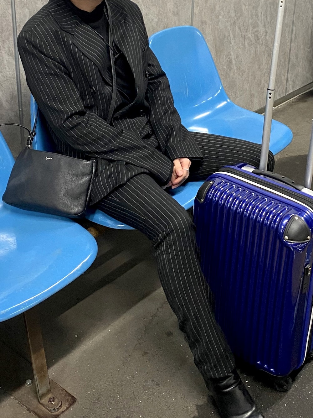 ストライプのセットアップに ヒールブーツで綺麗な Iラインを意識。