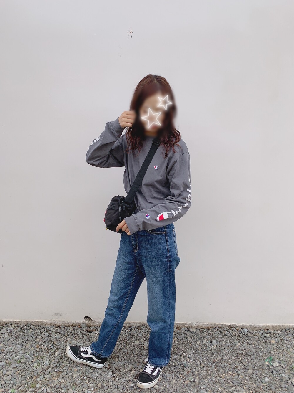 先日買ったばかりの champion の チャコールグレーのロンTを 着てみました!! 色もデザインも可愛くてお気に入りです!