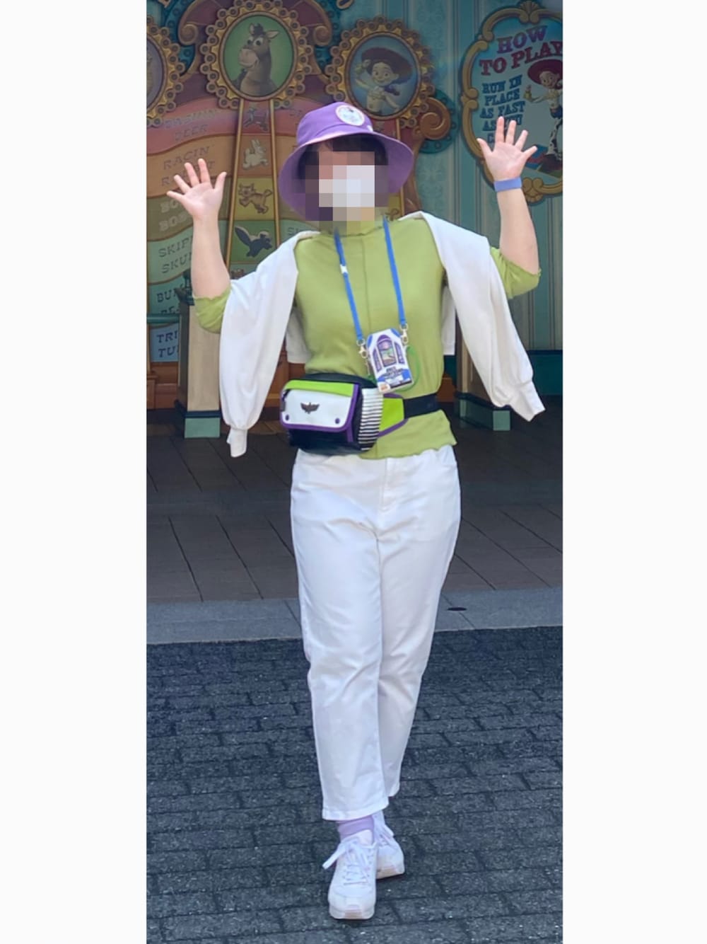 夢の国コーデ 大好きなバズ・ライトイヤーをモチーフに。 暑かったので、白のカットソーは肩掛けに。