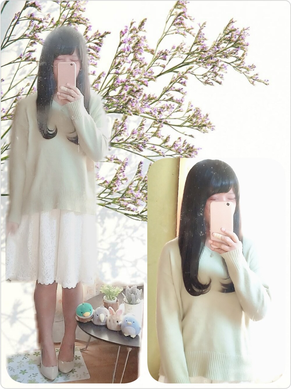 こんばんは♩ 見てくださり ありがとうございます(﹡ˆ﹀ˆ﹡)✨ 今日はふんわりフェミニンな 感じにしてみました♪*゚ トップスは淡いグリーンの色味の Vネックニットでボトムは白の レーススカートを合わせました(*´꒳`*)🌼 足元はベージュのスカラップパンプスを♩ 髪型はくるんと ワンカールに巻いてあります◡̈*✧ ワンポイントに蝶々の ネックレスもつけてます♪*゚