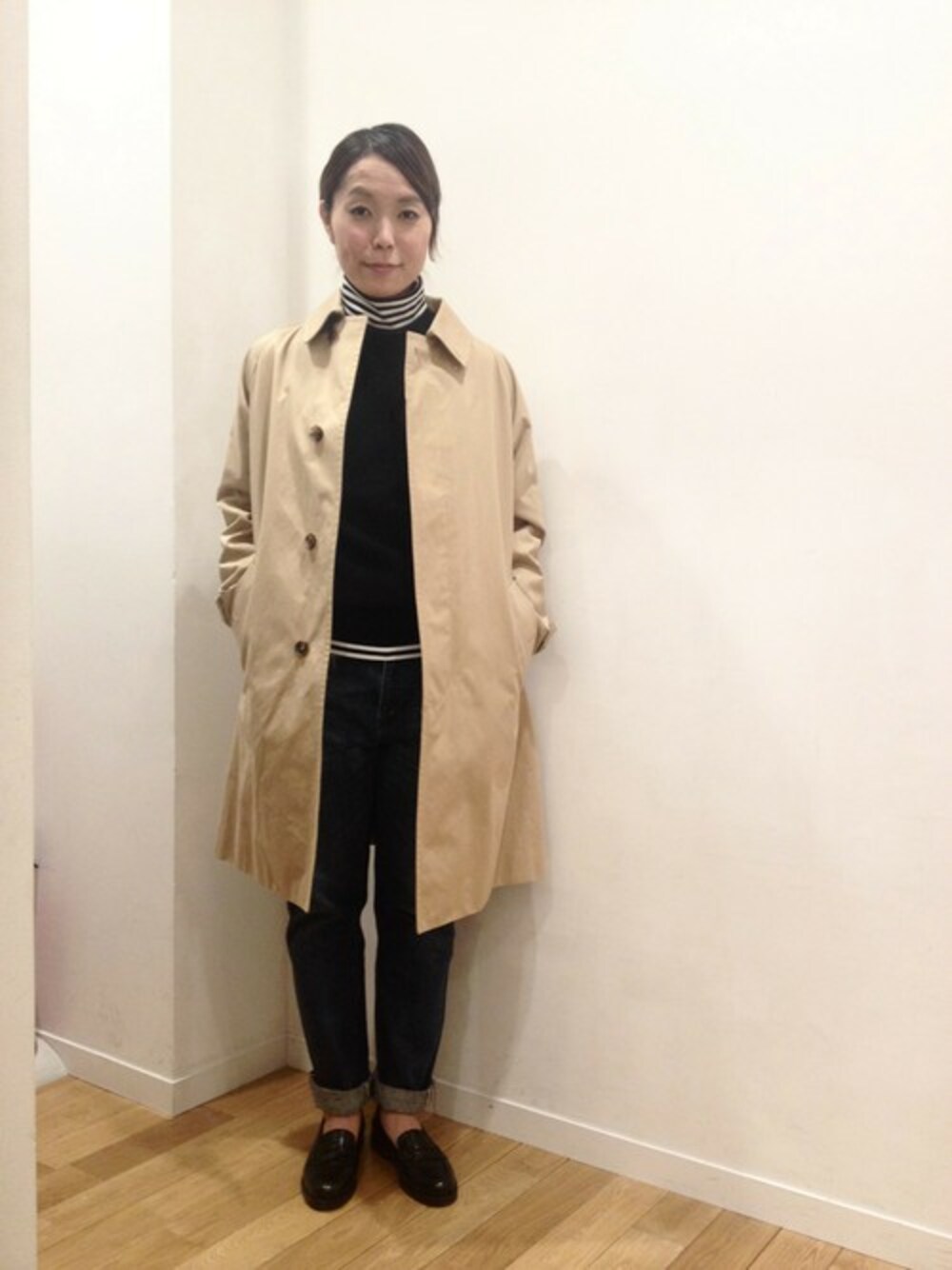 ジムフレックスのステンカラーコートは、ラグランの形なのでざっくりニットも着やすいです。 ニットとカットソーは色を合わせて、シンプルにまとめました。