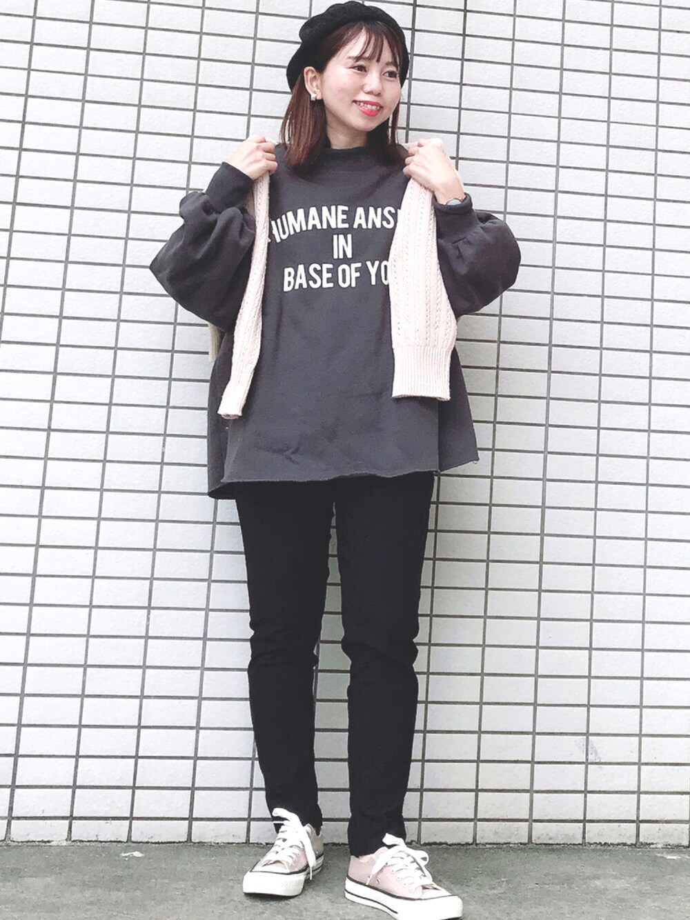 ご覧頂きありがとうございます♡ カジュアルコーデ組んでみました😊 トップスがダボッとしてるので、ボトムはスキニーですっきりまとめ、シンプルになり過ぎないようにベレー帽とニットの肩掛けをプラスしてみました😊