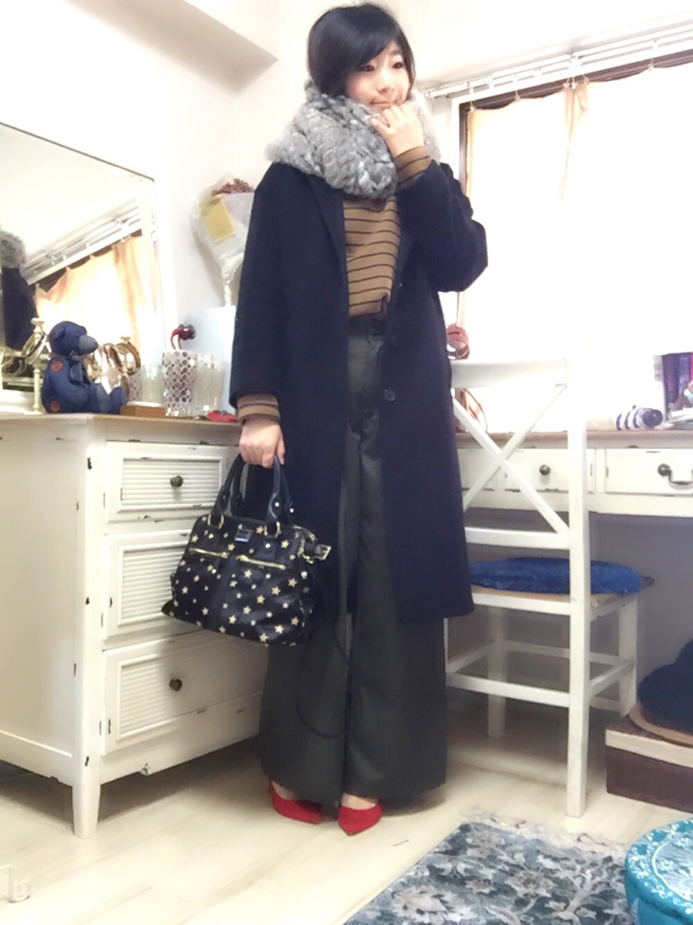 ✽+†+✽――✽+†+✽――✽+†+✽―― ご覧くださりありがとうございます☺︎ ✽+†+✽――✽+†+✽――✽+†+✽―― 今日は寒かったのでファーのストールでぐるぐる巻きに(*^ω^*) ハタチくらいのときからずっと大好きなワイドパンツは、去年からマイブームのプチプラショップ、r.p.sでとってもお得にゲットしました♡ しかも色違いでブラックも♡ ウエストゴムの甘やかしパンツです。 でもスキ。。。笑