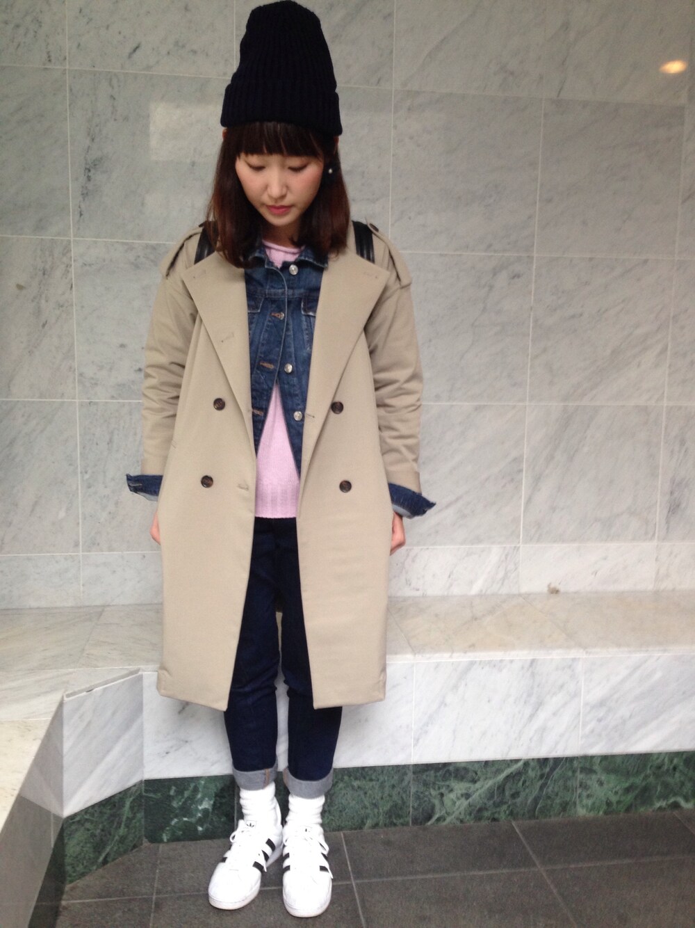いつまでたってもさーむーいー☃ トレンチ×Gジャンはあったかくて良い◎ ピンクのニット目立たせたくて他をネイビーで♡ ピンク×ネイビーの色合わせ大好き♡ ソラハ限定のクレマチスが可愛すぎる件♡