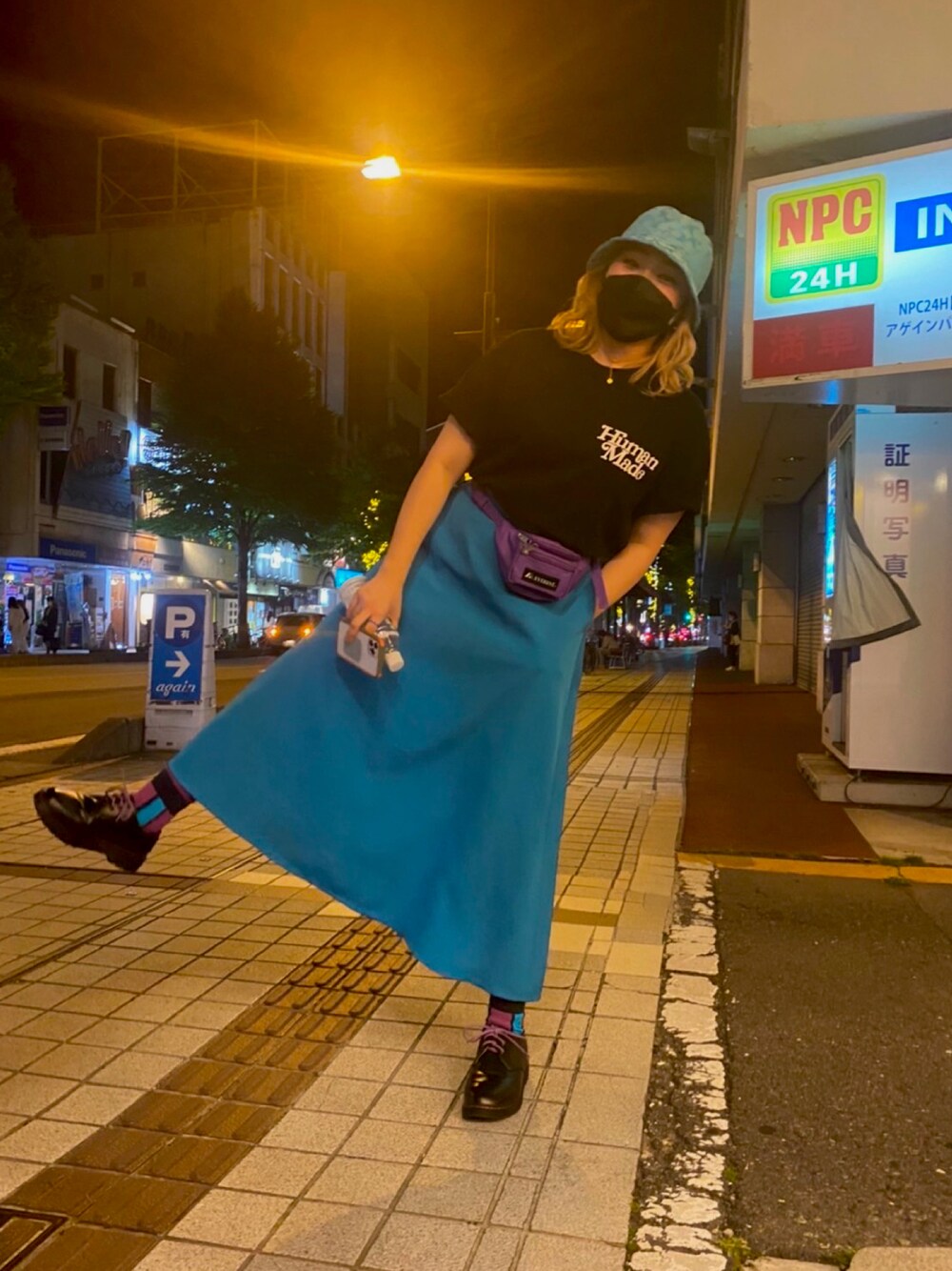 黒・水色・紫縛りでコーデを組みました! 上手く色を散らすことで鬱陶しくならずにコーデを組むことが出来ます! ウエストポーチにすることで脚長効果になります!