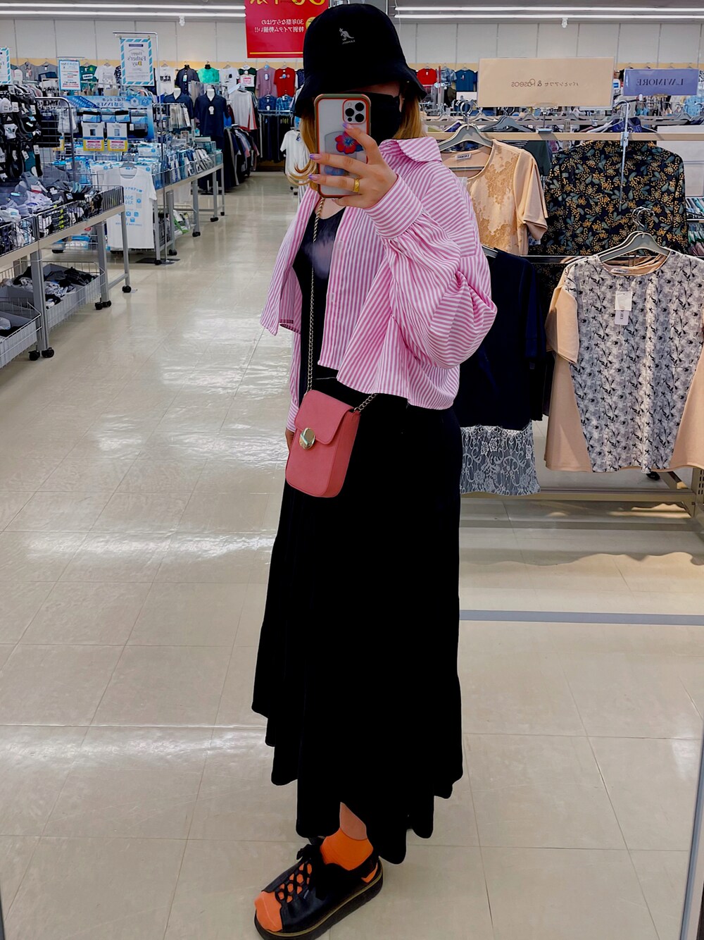 今日のカラーは『ピンク』💖🌺🎟💒 ワンピースにクロップド丈のシャツを合わせると脚長効果あり✨今の時期にピッタリなカラーソックスにサンダルスタイルが可愛い!!超プチプラでも合わせ方でなんとでもなる!! ⭐️夏はシャツとソックス無し!ピンクがバッグだけになってしまうので、帽子をピンクへ変更!!!⭐️ 今日もいってらっしゃい👋