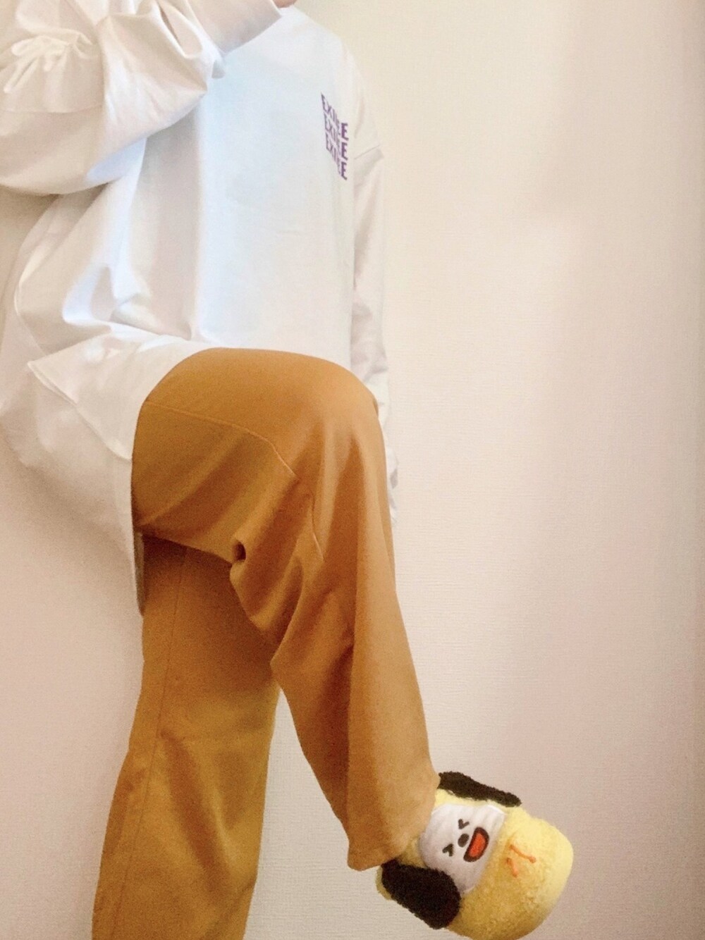オレンジ系のスラックス、ホワイト系のTシャツ/カットソー、イエロー系のその他シューズを着用したレディースの春コーディネートの1枚目の写真