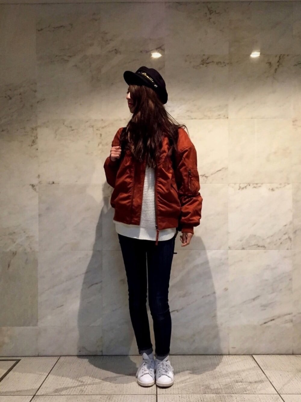オレンジのMA-1って 珍しくて一目惚れっ♡ このスキニーも履きすぎて 色落ちてきた← そろそろ新しいの欲しい。。 キャスケットも刺繍入っていて 一目惚れで即決した!!