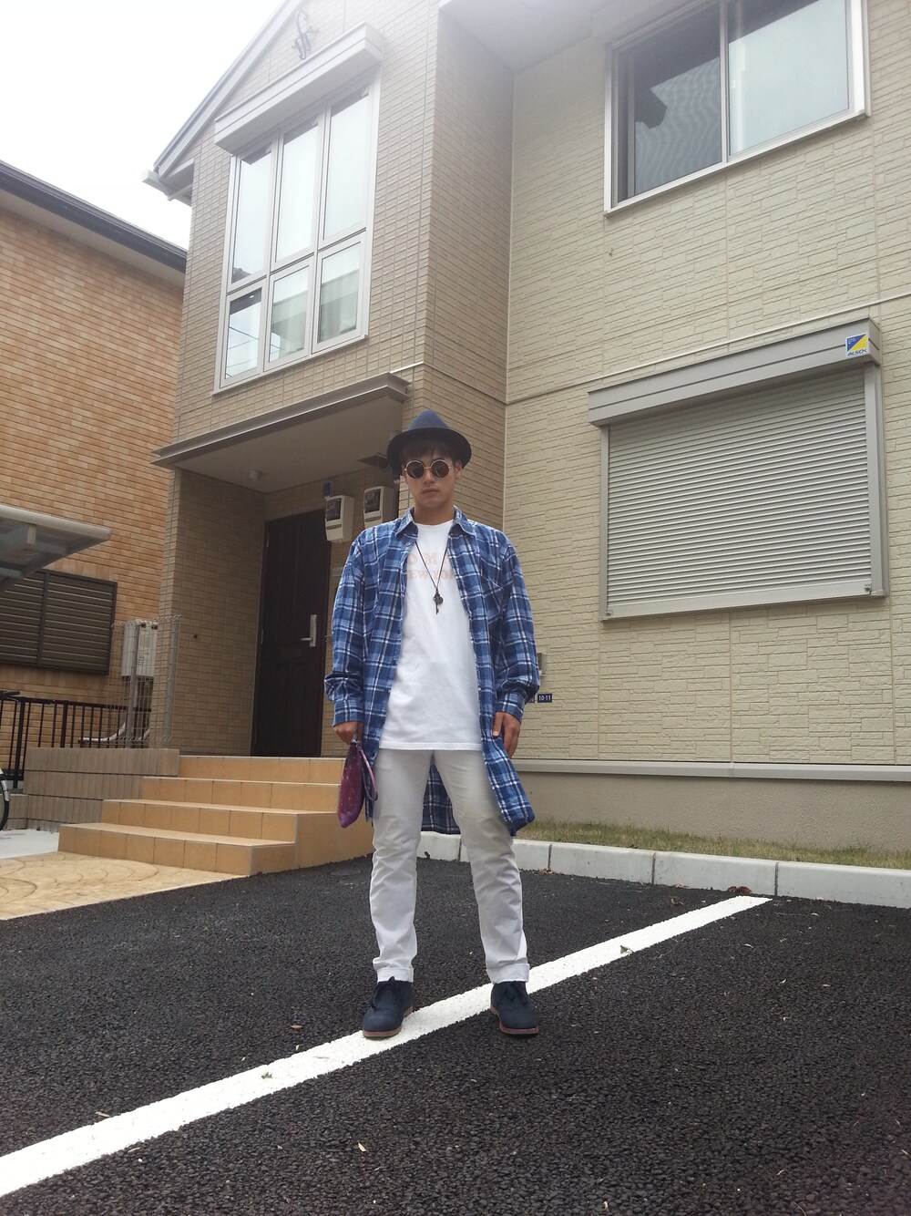 ブルー系のその他アウターを着用したメンズの春コーディネートの1枚目の写真