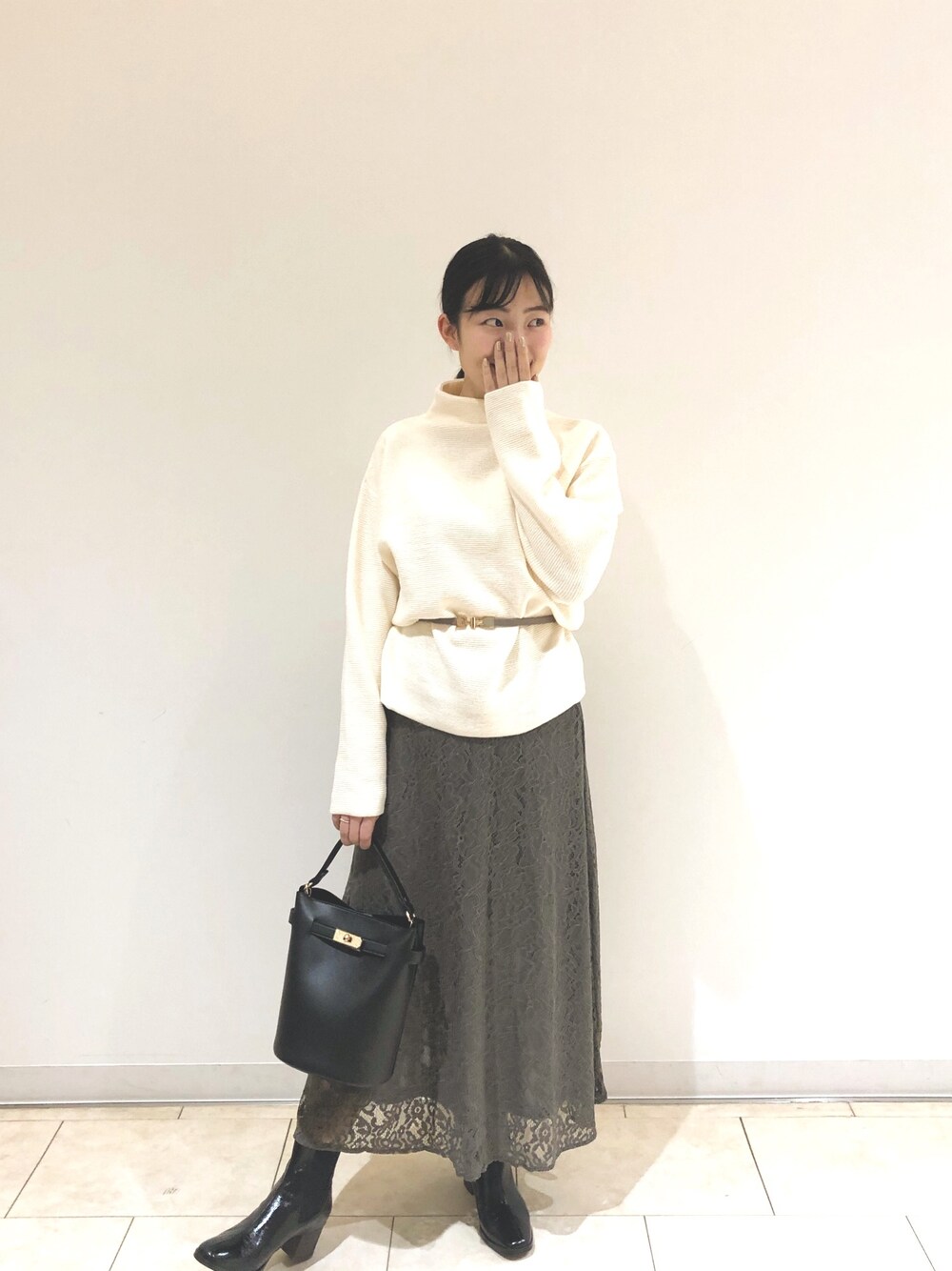 . こんにちは🌞 レースのスカートがかわいい コーディネートです♥︎ トップスをインしないで着用し、 ベルトをすることで腰回りを隠しつつ 足長効果を狙っています😀 小物を黒で統一して 落ち着いた大人っぽさを出してみました~