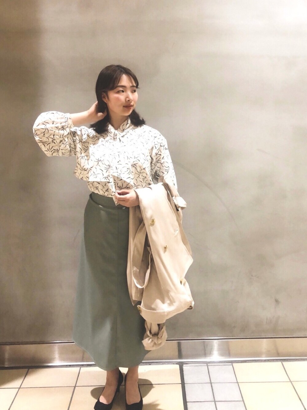 春のきれいめなコーディネートです💐 レザーのスカートはストレッチが効いていて、とても履きやすかったです☺︎ さわやかなグリーンにブラウスのデザインがとても映えます🌼