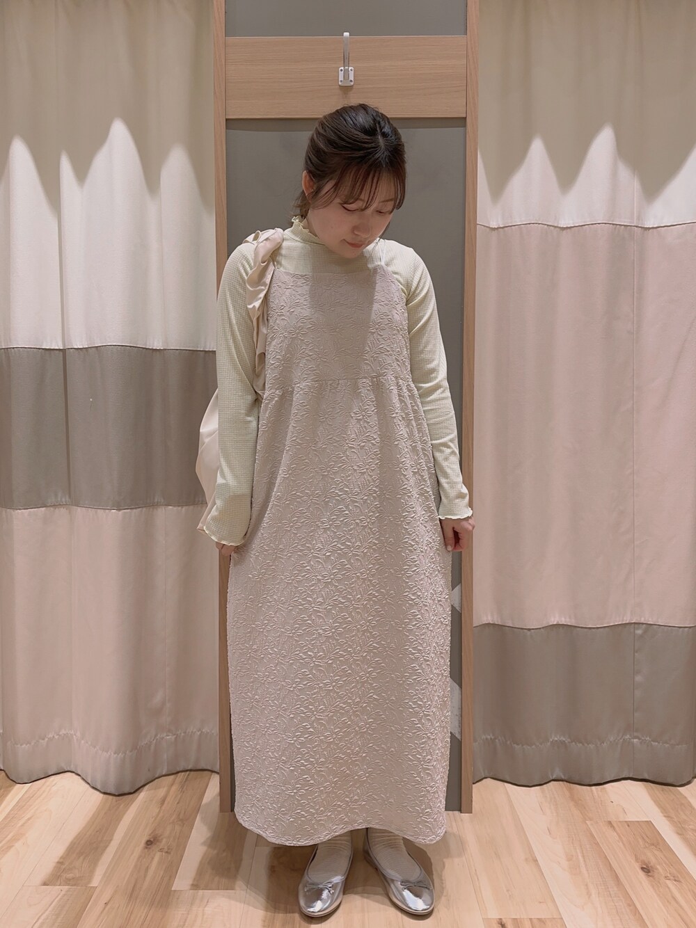 セットのキャミワンピースのインナーを組み替えてみました◎ 春らしいカラーで着回しが楽しめます♩ バッグはシャーリング仕様で形が可愛らしいです💭