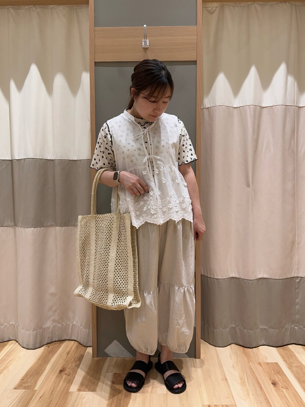ティアードが可愛らしいパンツにガーリーなトップスを合わせてみました◎ ベストは薄手なので重ね着してもサラッとした着心地です!夏のレイヤードにぴったりです♩