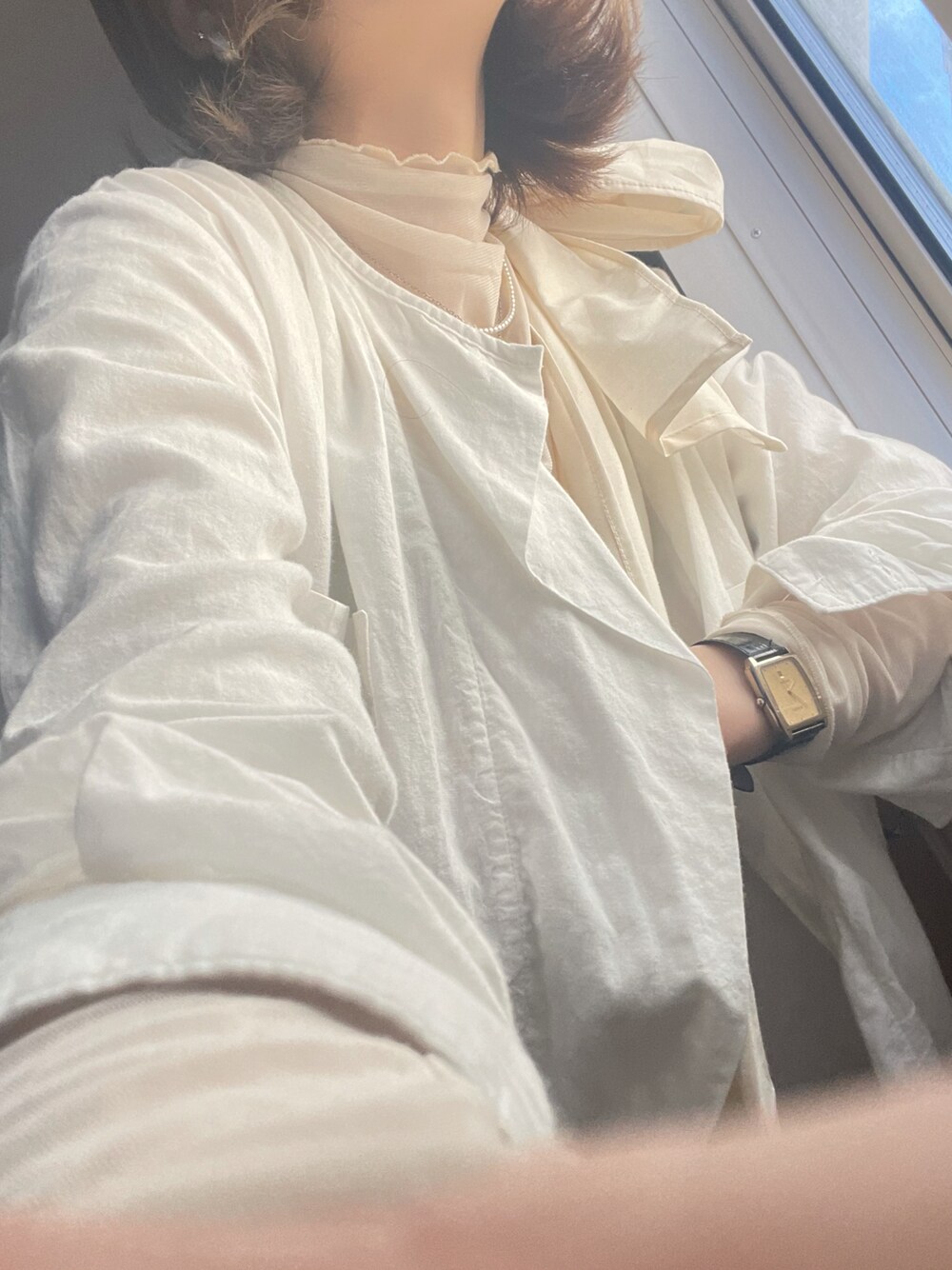 "パリの窓からこんにちわ フランスパン買いにいかなくちゃっ" コーデ いつになっても色んな素材の白を重ねるの楽しいし好き