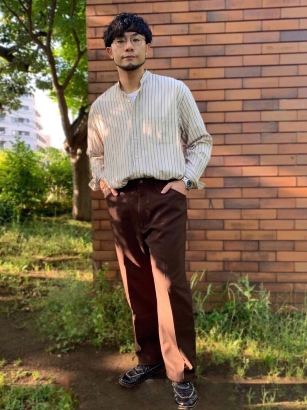 Sigのバンドカラーシャツを茶系でまとめたコーデ。 落ち感があるレーヨン素材は通常水に弱くてシワになりやすいですが、こちらは特殊加工で水に強くなっているそうです。 実際洗濯機で洗ってもそこまでシワは目立たず、そのまま着用できるので愛用しています。 少しフレアしているきれい目なブラウンのパンツにタックインして、トレンドっぽい着こなしにしてみました。
