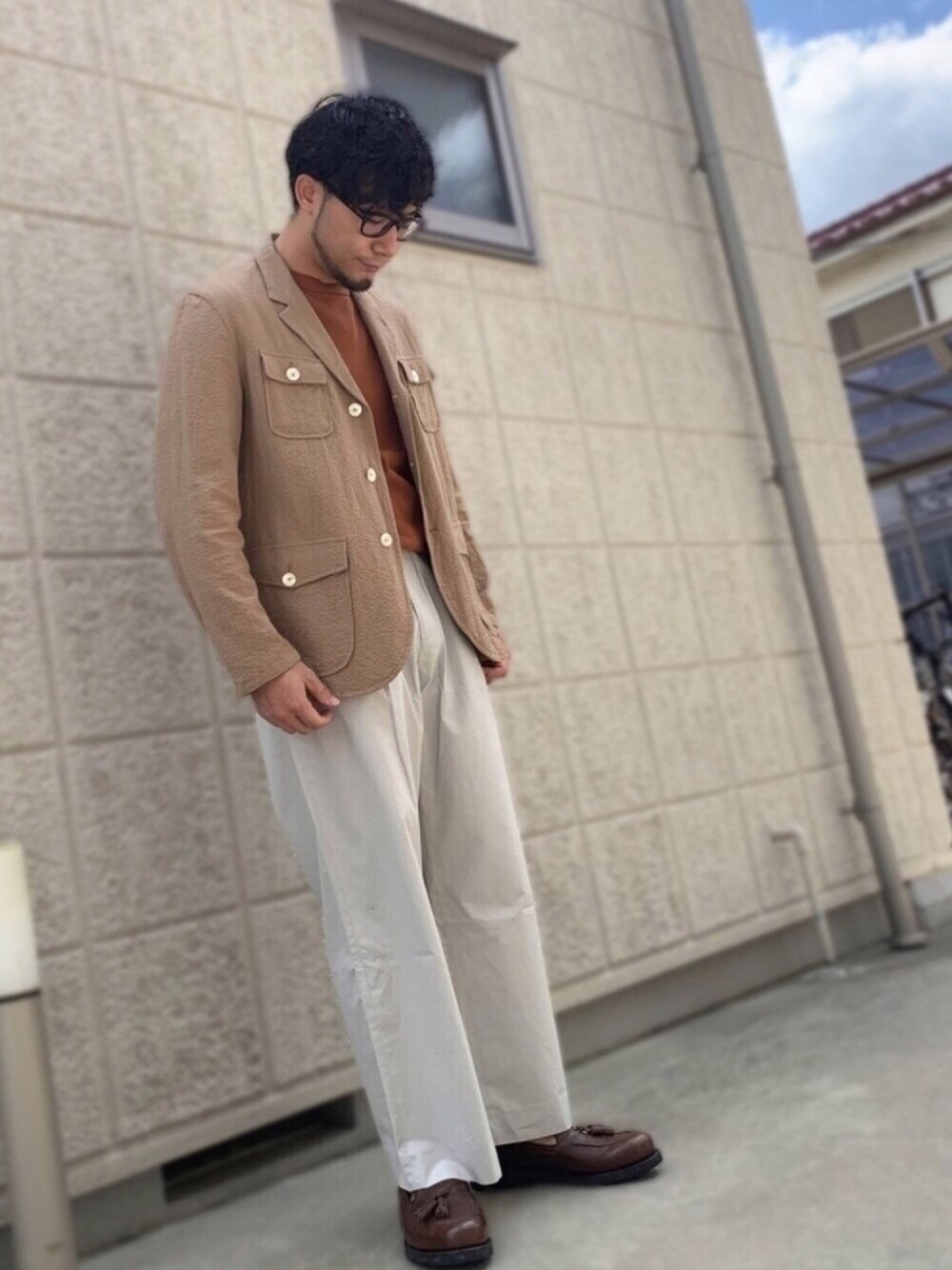 ベージュ系でまとめたコーディネート。 シアサッカーのサファリジャケットがコンパクトなシルエットなので、ワイドパンツを合わせてAラインにしました。 春夏は暑くてトップスを着用せず手持ちすることも多いので、シアサッカーなどシボ感のある素材はシワが気にならなくて重宝しています。