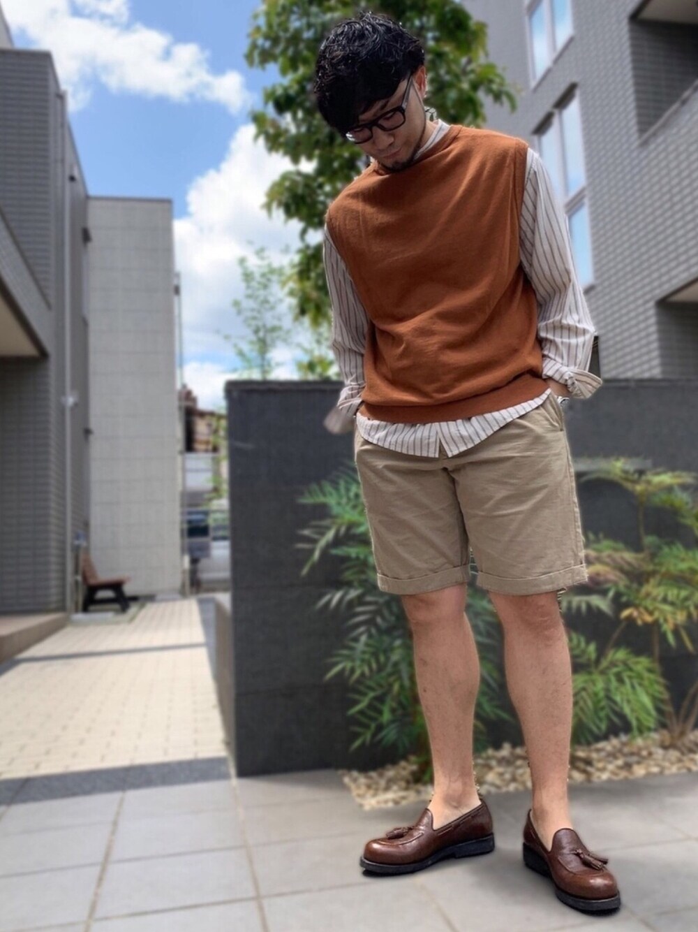 ベージュ系のワントーンコーデ。 涼しくてリラックス感があるのでショーツが好きですが、子供っぽい印象になり過ぎないように長袖シャツを合わせることが多いです。 ニットベストはきれい目な印象のままレイヤードできるので良いですね。 インナーかパンツと同色系でまとめるのが合わせやすいと思います。 レザーのローファーで上品さを出しつつ、脚がすっきり見えるようにしています。