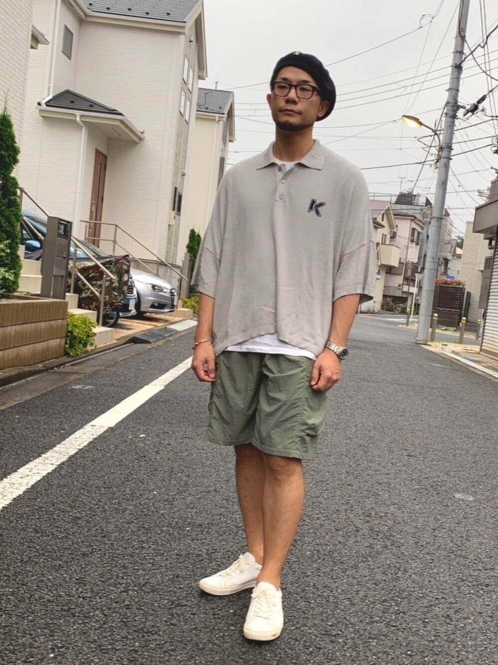ドロップショルダーのニットポロにサイズアップした大きめのカーゴショーツを合わせたコーデ。 半袖短パンでYラインシルエットを作ることを意識しました。 全身ペールトーンとニットポロで少しでも大人っぽい上品な印象になるよう努力しています。。