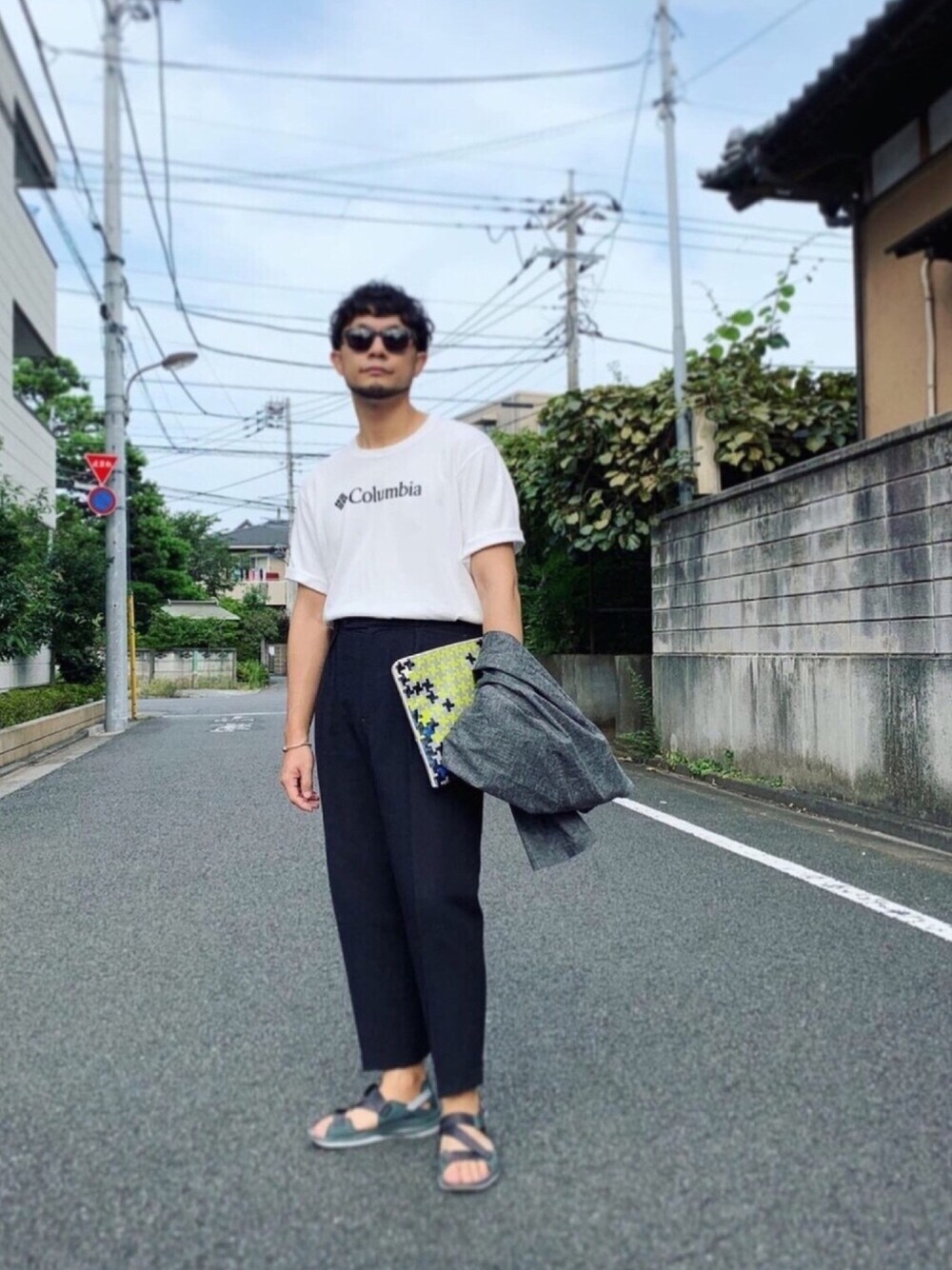 ロゴプリントTシャツにセンタープレスのスラックスを合わせた大人カジュアルコーデ。 共に紙糸が入っていて吸水速乾性が高いので真夏も快適です! 【きれい目ポイント】 ▪️Tシャツにスラックス ▪トップスの️タックイン ▪️ジャケットを携帯 【スタイルアップポイント】 ▪️股上が深いパンツをハイウェストでタックインして腰を高く見せる ▪️9分丈テーパードにスポサンで足元すっきり